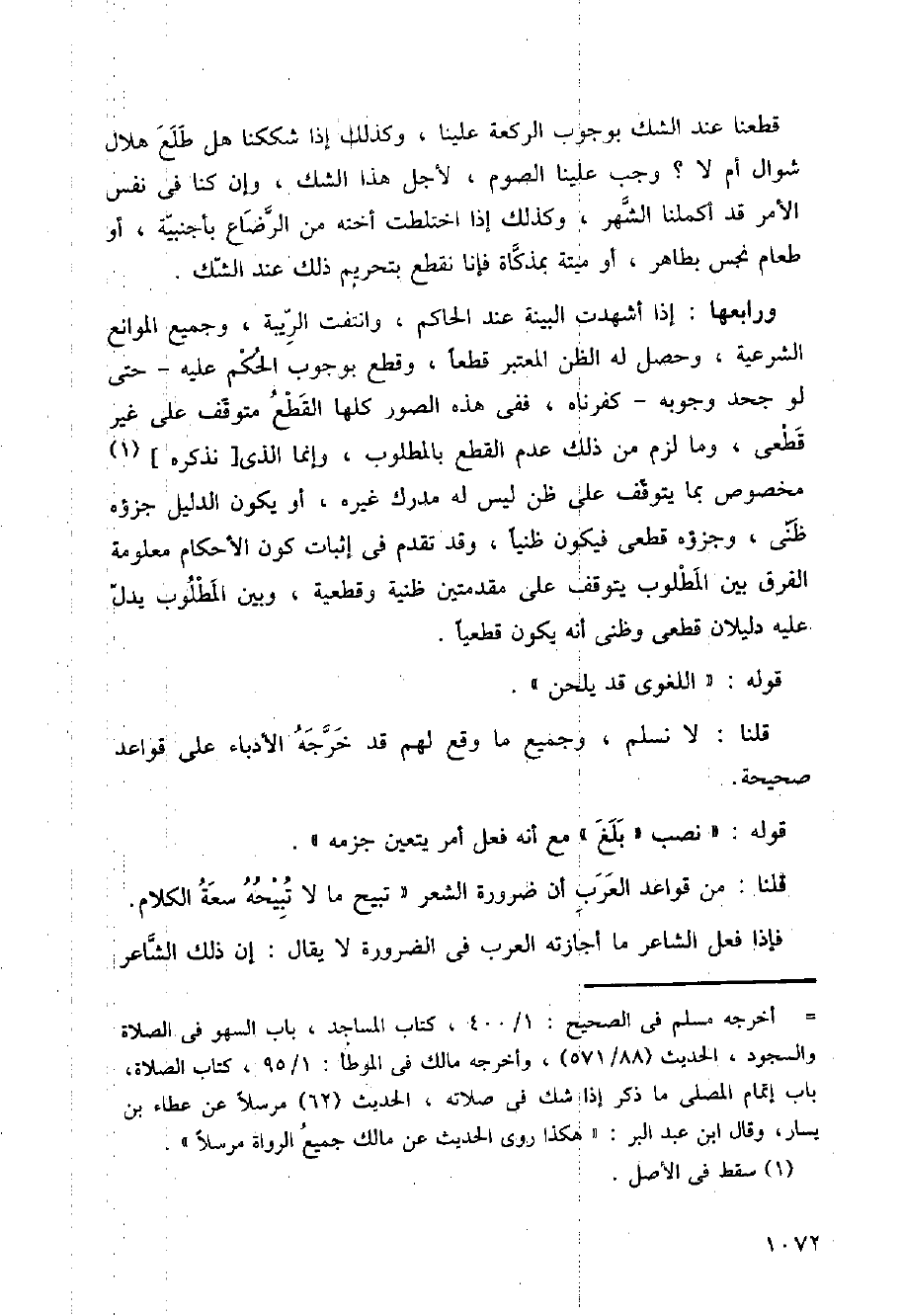 قطعنا عند الشك بوجوب الركعة علينا، وكذلك إذا شككنا هل طلع هلال شوال أم لا؟ وجب علينا الصوم، لأجل هذا الشك، وإن كنا في نفس الأمر قد أكملنا الشهر، وكذلك إذا اختلطت أخته من الرضاع بأجنبية، أو طعام نجس بطاهر، أو ميتة بمذكاة فرنا نقطع بتحريم ذلك عند الشك.