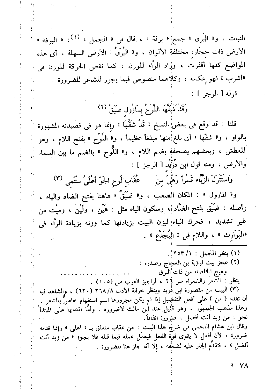 و (البرق) الأرض السهلة، أي هذه المواضع كلما أقفرت، وزاد الراء للوزن، كما نقص الحركة للوزن في (أشرب) فهو عكسه، وكلاهما منصوص فيما يجوز للشاعر للضرورة
