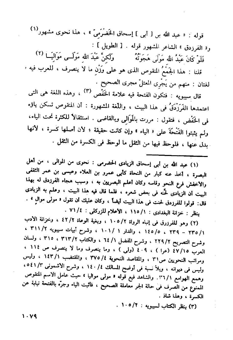 قال سيبويه: فتكون الفتحة فيه علامة خفض، وهذه اللغة هي التي اعتمدها الفرزدق في هذا البيت، واللغة المشهورة: أن المنقوص تسكن ياؤه في الخفض، فنقول: مررت بالموالي وبالقاضي، استثقالا للكثرة تحت الياء، ولم يثبتوا الفتحة على (الياء) وإن كانت حقيقة؛ لأن أصلها كسرة؛ لأنها بدل عنها، فلوحظ فيها من الثقل ما لوحظ في الكسرة من الثقل.