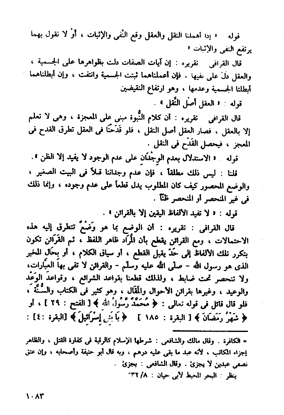 قال القرافي تقريره: إن آيات الصفات دلت بظواهرها على الجسمية، و، العقل دل على نفيها، فإن أعملناهما ثبتت الجسمية وانتفت، وإن أبطلناهما أبطلتا الجسمية وعدمها، وهو ارتفاع النقيضين