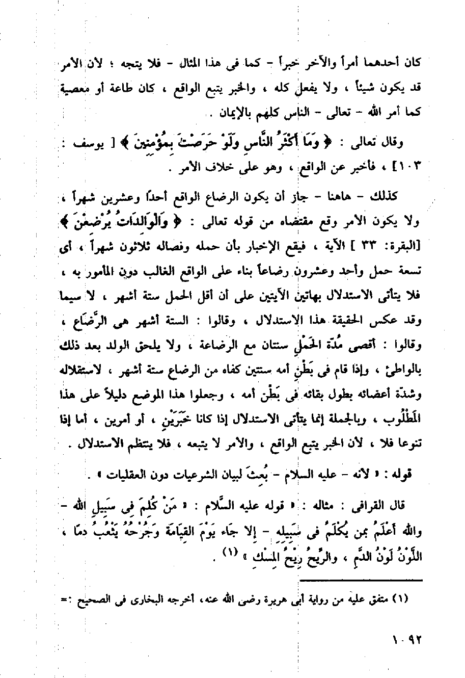 كذلك هاهنا جاز أن يكون الرضاع الواقع أحدا وعشرين شهرا، ولا يكون الأمر وقع مقتضاه من قوله تعالى (والوالدات يرضعن) [آلبقرة:33] الآية، فيقع الإخبار بأن حمله وفصاله ثلاثون شهرًا، أي تسعة حمل وأحد وعشرون رضاعا بناء على الواقع الغالب دون المأمور به، لا يأتي الاستدلال بهاتين الآيتين على أن أقل الحمل ستة أشهر، ولا سيما وقد عكس الحقيقة هذا الاستدلال، وقالوا: الستة أشهر هي الرضاع، وقالوا أقضى مدة الحمل سنتان مع الرضاعة، ولا يلحق الولد بعد ذلك بالواطيء، وإذا قام في بطن أمه سنتين كفاه من الرضاع سته أشهر، لاستقلاله وشدة أعضائه بطول بقائه في بطن أمه، وجعلوا هذا الموضع دليلا على هذا المطلوب، وبالجملة إنما يتأتى الاستدلال إذا كانا خبرين، أو أمرين، أما إذا تنوعا فلا، لأن الخبر يتبع الواقع، والأمر لا يتبعه، فلا ينتظم الاستدلال.