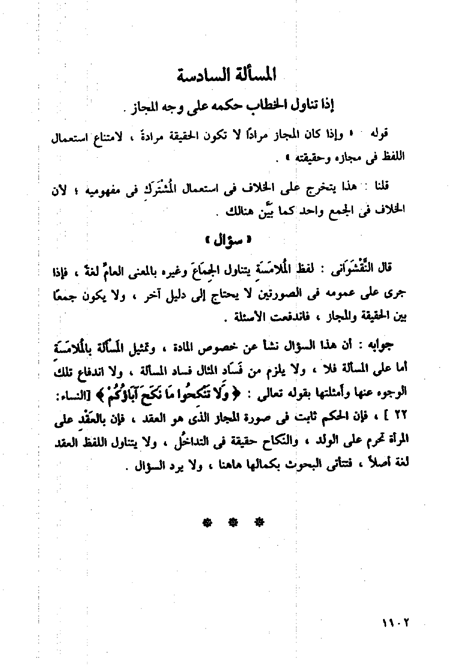 جوابه: أن هذا السؤال نشأ عن خصوص المادة، وتمثيل المسألة بالملامسة أما على المسألة فلا، ولا يلزم من فساد المثال فساد المسألة، ولا اندفاع تلك الوجوه عنها وأمثلتها بقوله تعالى: (ولا تنكحوا ما نكحوا آباؤكم) [النساء:22]، فإن الحكم ثابت في صورة المجاز الذي هو العقد، فإن بالعقد على المرأة تحرم على الولد، والنكاح حقيقة في التداخل، ولا يتناول اللفظ العقد لغة أصلا، فتتأتى البحوث بكمالها هاهنا، ولا يرد السؤال.