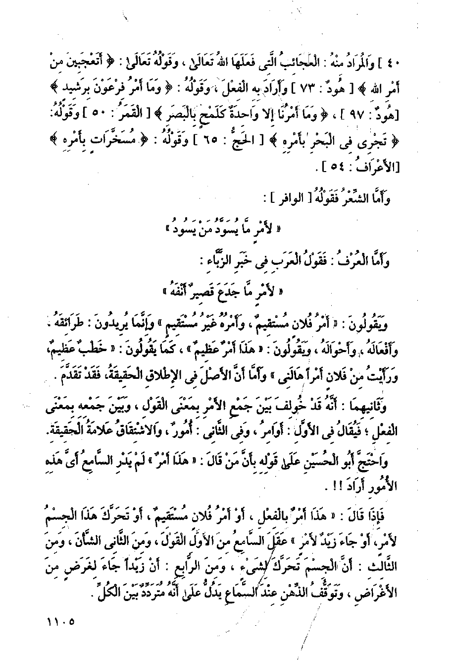 40] والمراد منه: العجائب التي فعلها الله تعالى، وقوله تعالى: (أتعجبين من أمر الله) [هود:73] وأراد به الفعل، وقوله: (وما أمر فرعون برشيد) [هود:97]، (وما أمرنا إلا واحدة كلمح بالبصر) [القمر:50] وقوله: (تجري في البحر بأمره) [الحج: 65] وقوله: (مسخرات بأمره) [الأعراف:54].