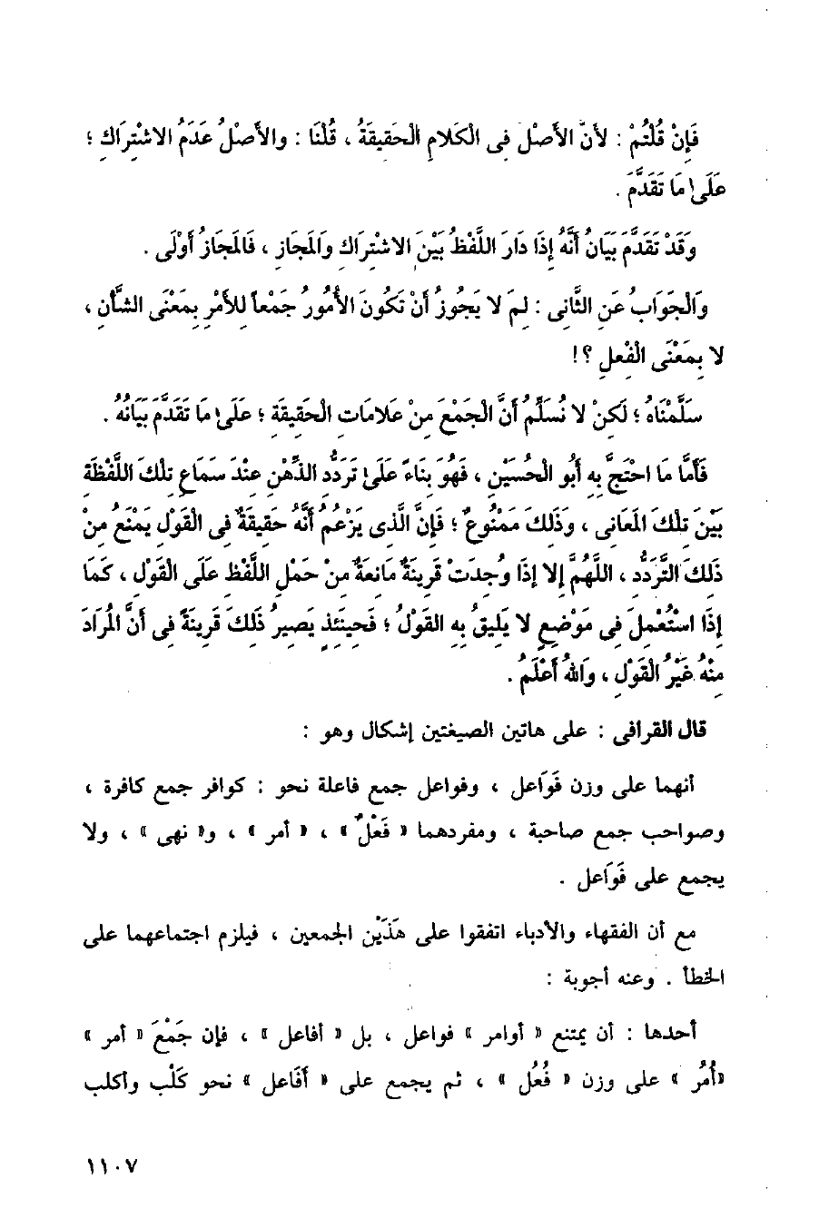 أحدها: أن يمتنع (أوامر) فواعل، بل (أفاعل)، فإن جمع (أمر) (أُمُر) على وزن (فُعُل)، ثم يجمع على (أفاعل) نحو كَلب وأكلب.