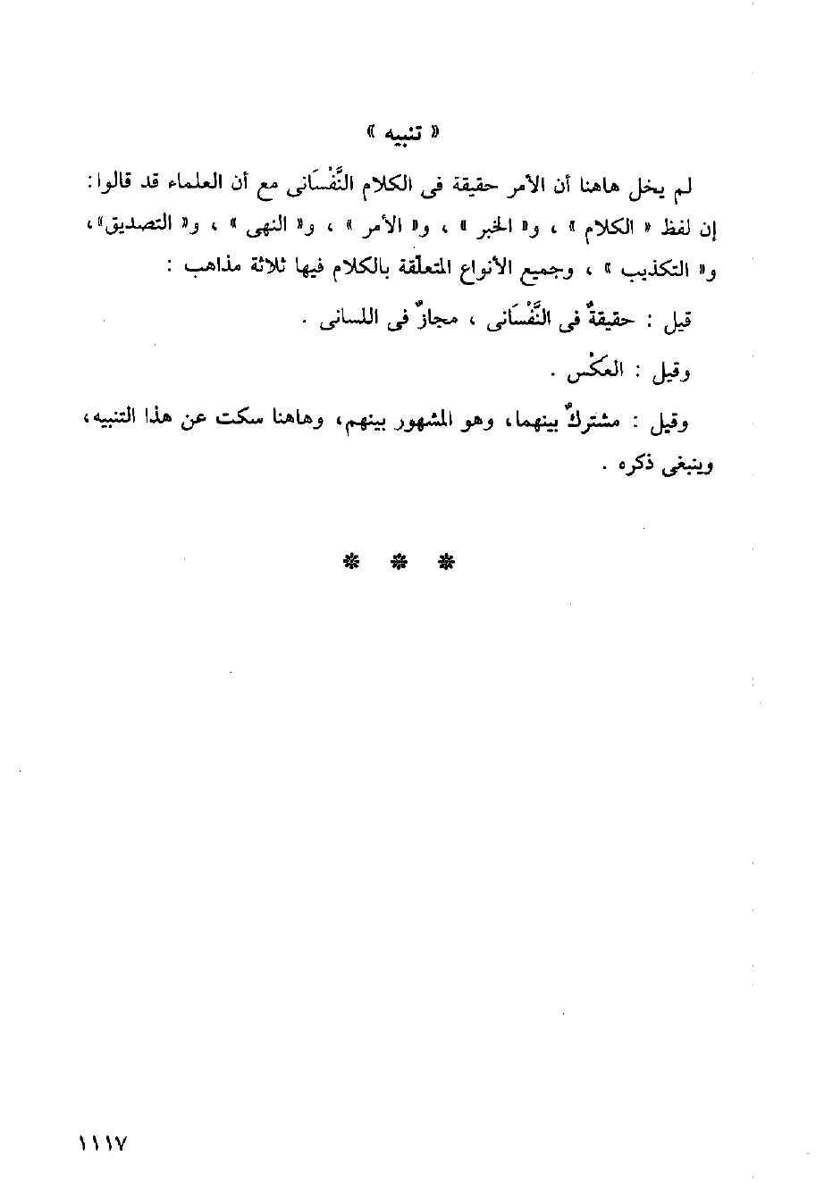 لم يخل هاهنا أن الأمر حقيقة في الكلام النفساني مع أن العلماء قد قالوا: إن لفظ (الكلام)، و (الخبر)، و (الأمر)، و (النهي) و (التصديق)، و (التكذيب)، وجميع الأنواع المتعلقة بالكلام فيها ثلاثة مذاهب: