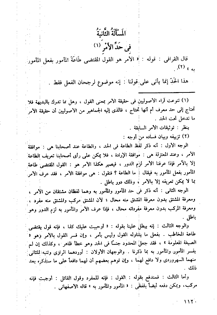 قال القرافي: قوله: (الأمر هو القول المقتضي طاعة المأمور بفعل المأمور به)
