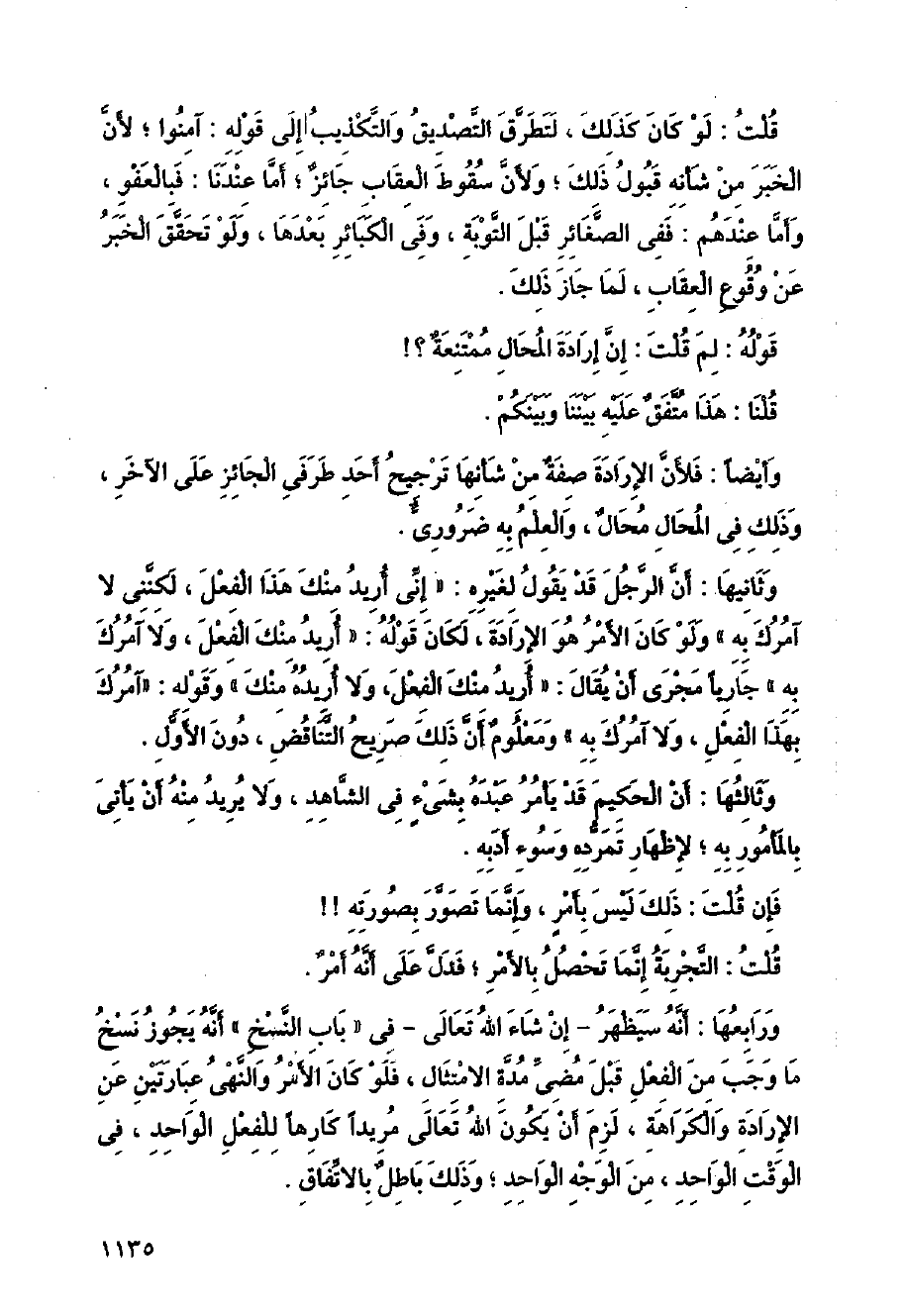 ورابعها: أنه سيظهر إن شاء الله تعالى في (باب النسخ) أنه يجوز نسخ ماوجب من الفعل قبل مضى مدة الامتثال، فلو كان الأمر والنهي عبارتين عن الإرادة والكراهة، لزم أن يكون الله تعالى مريدا كارها للفعل الواحد، في الوقت الواحد من الوجه الواحد، وذلك باطل بالاتفاق