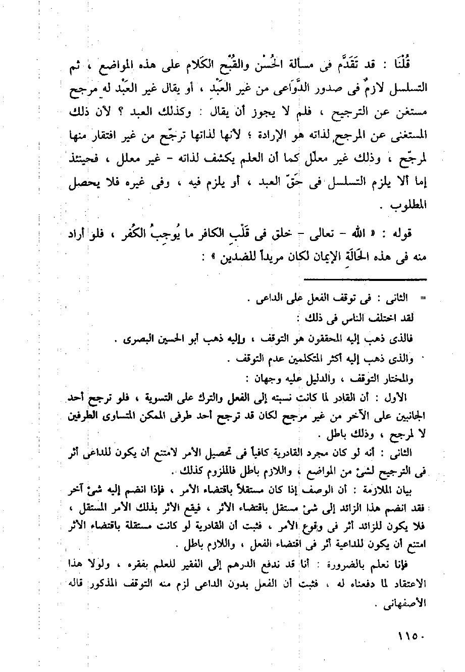 قلنا: قد تقدم في مسألة الحسن والقبح الكلام على هذه المواضع، ثم التسلسل لازم في صدور الدواعي من غير العبد، أو يقال غير العبد له مرجح مستغن عن الترجيح، فلم لا يجوز أن يقال: وكذلك العبد؟ لأن ذلك المستغني عن المرجح لذاته هو الإرادة، لأنها لذاتها ترجح من غير افتقار منها لمرجح، وذلك غير معلل كما أن العلم يكشف لذاته غير معلل، فحينئذ إما ألا يلزم التسلسل في حق العبد، أو يلزم فيه، وفي غيره فلا يحصل المطلوب.
