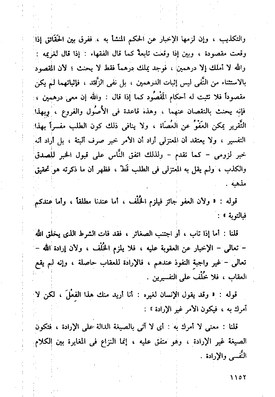 والتكذيب، وإن لزمها الإخبار عن الحكم المنشأ به، ففرق بين الحقائق إذا وقعت مقصودة، وبين إذا وقعت تابعة كما قال الفقهاء: إذا قال لعزيمه: والله لا أملك إلا درهمين، فوجد يملك درهما فقط لا يحنث، لأن المقصود بالاستثناء من النفي ليس إثبات الدرهمين، بل نفي الزائد، فإثباتهما لم يكن مقصودا فلا تثبت له أحكام المقصود كما نفى الزائد، فإثباتهما لم يكن مقصودا فلا تثبت له أحكام المقصود كما إذا قال: والله إن معي درهمين، فإنه يحنث بالنقصان عنهما، وهذه قاعدة في الأصول والفروع، وبهذا التقرير يمكن العفو عن العصاة، ولا ينافي ذلك كون الطلب مفسرا بهذا التفسير، ولا يعتقد أن المعتزلي أراد أن الأمر هبر صرف ألبتة، بل أراد أنه خبر لزومي كما تقدم، ولذلك اتفق الناس على قبول الخبر للصدق والكذب، ولم يقل به المعتزلي في الطلب قطو فظهر أن ما ذكرته هو تحقيق مذهبه.