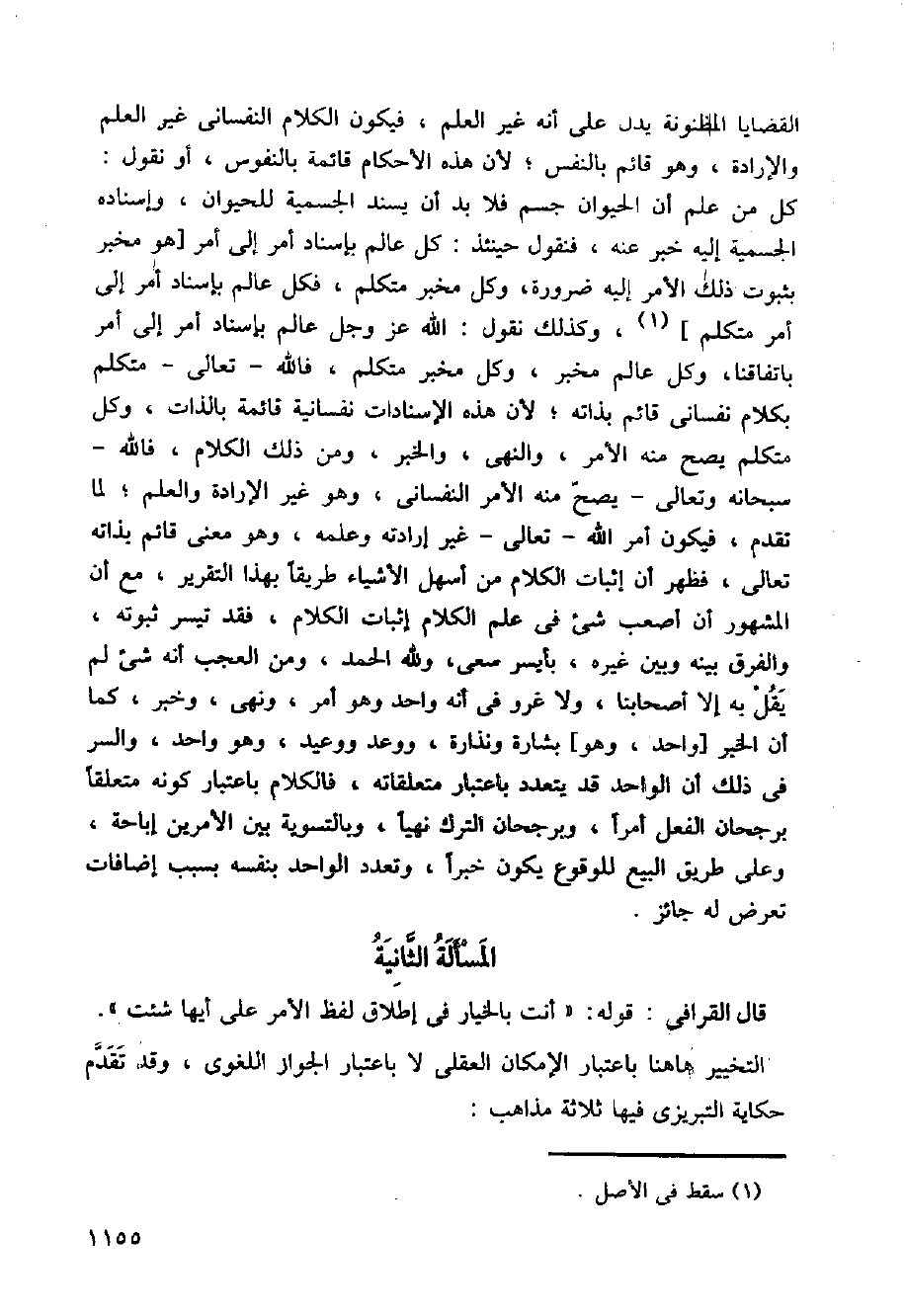 القضايا المظنونة يدل على أنه غير العلم، فيكون الكلام النفساني غير العلم والإرادة، وهو قائم بالنفس، لأن هذه الأحكام قائمة بالنفوس، أو نقول: كل من علم أن الحيوان جسم فلا بد أن يسند الجسمية للحيوان، وإسناده الجسمية إليه خبر عنه، فنقول حينئذ: كل عالم بإسناد أمر إلى أمر [هو مخبر بثبوت ذلك الأمر إليه ضرورة وكل مخبر متكلم، فكل عالم بإسناد أمر إلى أمر متكلم]، وكذلك نقول: الله عز وجل عالم بإسناد أمر إلى أمر باتفاقنا، وكل عالم مخبر، وكل مخبر متكلم، فالله تعالى متكلم بكلام نفساني قائم بذاته، لأن هذه الإسنادات نفسانية قائمة بالذات، وكل متكلم يصح منه الأمر، والنهي، والخبر، ومن ذلك الكلام، فالله سبحانه وتعالى يصح منه الزمر النفساني وهو غير الإرادة والعلم، لما تقدم، فيكون فيكون أمر الله تعالى غير إرادته وعلمه، وهو معنى قائم بذاته تعالى، فظهر أن إثبات الكلام من أسهل الأشياء طريقا بهذا التقرير، مع أن المشهور أن أصعب شيء في علم الكلام إثبات الكلام، فقد تيسر ثبوته، والفرق بينه وبين غيره، بأيسر سعي، ولله الحمد، ومن العجب أنه شيء لم يقل به إلا أصحابنا، ولا غرو في أنه واحد وهو أمر، ونهي، وخبر، كما أن الخبر [واحد، وهو] بشارة ونذارة، ووعد ووعيد، وهو واحد، والسر في ذلك أن الواحد قد يتعدد باعتبار متعلقاته، فالكلام باعتبار كونه متعلقا برجحان الفعل أمرا، ويرجحان الترك نهائيا، وبالتسوية بين الأمرين إباحة، وعلي طريق البيع للوقوع يكون خبرا، وتعدد الواحد بنفسه بسبب إضافات تعرض له جائز.