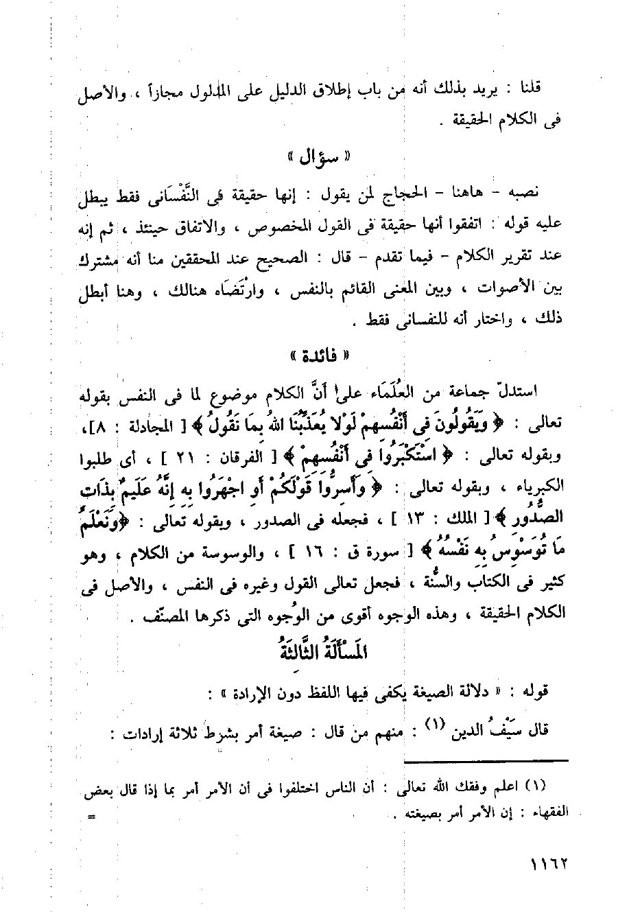 استدل جماعة من العلماء على أن الكلام موضوع لما في النفس بقوله تعالى: (ويقولون في أنفسهم لولا يعذبنا الله بما نقول) [المجادلة:8]، وبقوله تعالى: (استكبروا في أنفسهم) [آلفرقان:21]، أي طلبوا الكبرياء، وبقوله تعالى: (وأسروا قولكم زو اجهروا به رنه عليم بذات الصدور) [آلملك:13] فجعله في الصدور، وبقوله تعالى: (ونعلم ما توسوس به نفسه) [سورة ق:16]، والوسوسة من الكلام، وهو كثير في الكتاب والسنة، فجعل تعالى القول وغيره في النفس، والأصل في الكلام الحقيقة، وهذه الوجوه أقوى من الوجوه التي ذكرها المصنف.