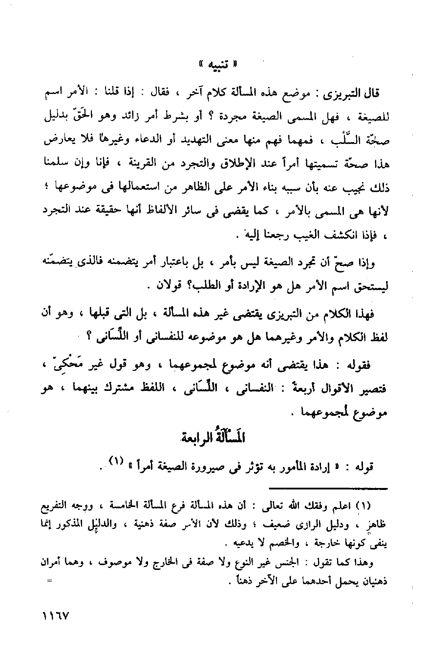 فهذا الكلام من التبريزي يقتضي غير هذه المسألة، بل التي قبلها، وهو أن لفظ الكلام والأمر وغيرهما هل هو موضوعه للنفساني أو اللساني؟
