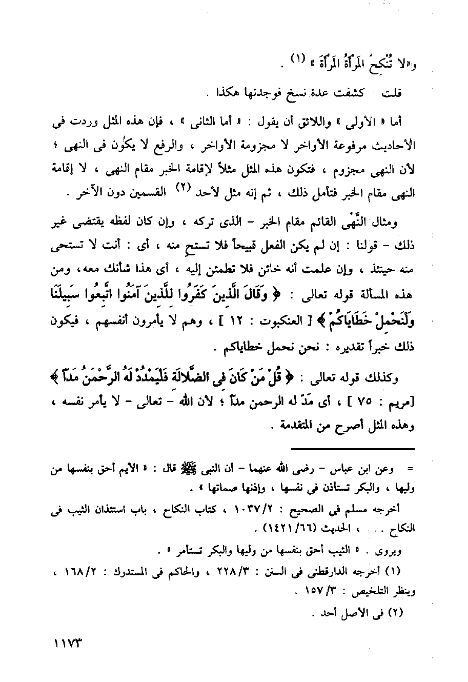 ومثال النهي القائم مقام الخبر، الذي تركه، وإن كان لفظه يقتضي غير ذلك قولنا: إن لم يكن الفعل قبيحا فلا تستح منه، أي: أنت لا تستحي منه حينئذ، وإن علمت زنه خائن فلا تطمئن إليه، أي هذا شأنك معه، ومن هذه المسألة قوله تعالى: (وقال الذين كفروا للذين آمنوا اتبعوا سبيلنا ولنحمل خطاياكم] [العنكبوت:12]، وهم لا يأمرون أنفسهم، فيكون ذلك خبرا تقديره: نحن نحمل خطاياكم.