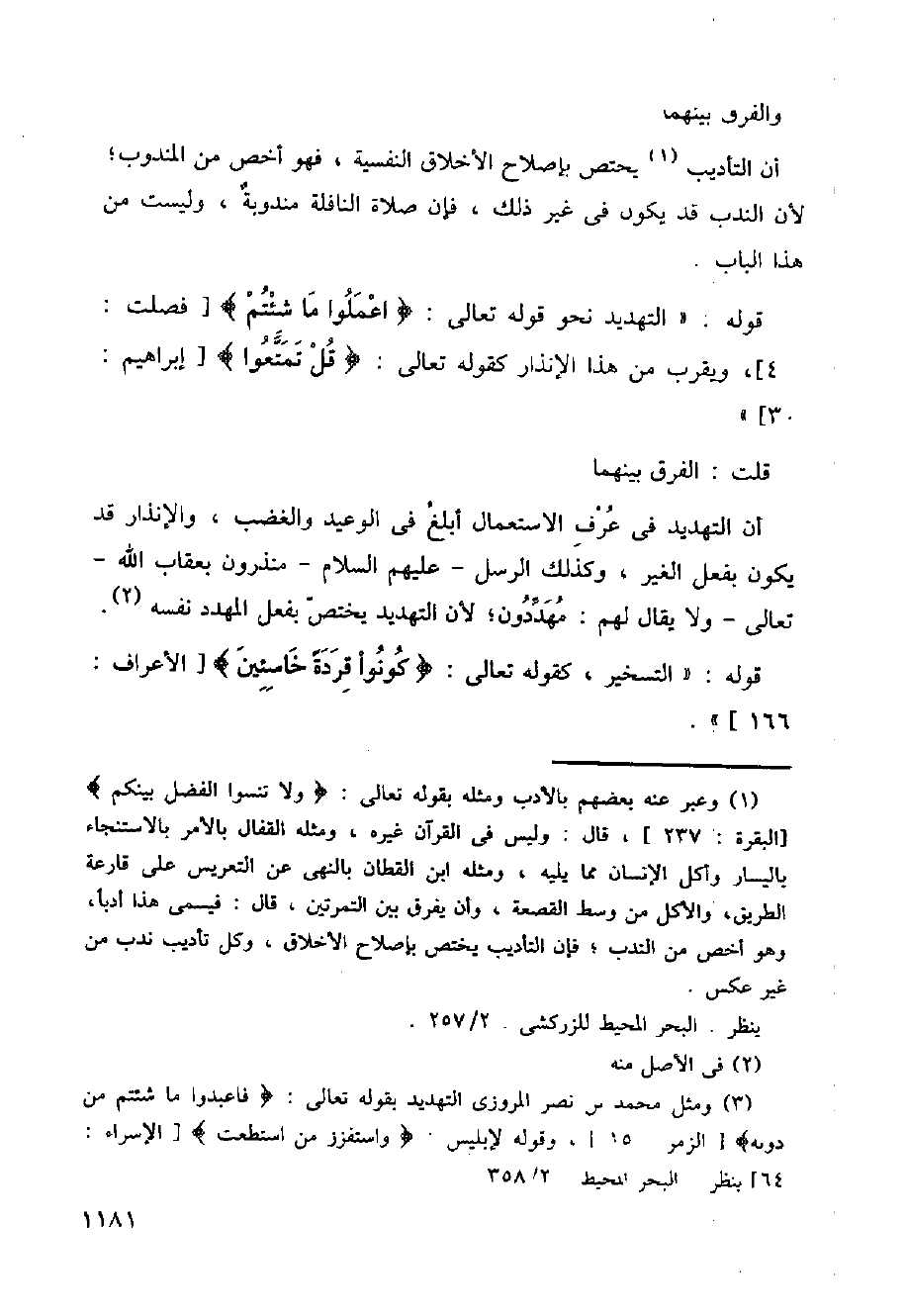 أن التهديد في عرف الاستعمال أبلغ في الوعيد والغضب، والإنذار قد يكون بفعل الغير، وكذلك الرسل، عليهم السلام، منذورون بعقاب الله تعالى ولا يقال لهم: مهددون، لأن التهديد يختص بفعل المهدد نفسه، قوله: (التسخير) كقوله تعالى: (كونوا قردة خاسئين) [الأعراف: 166]