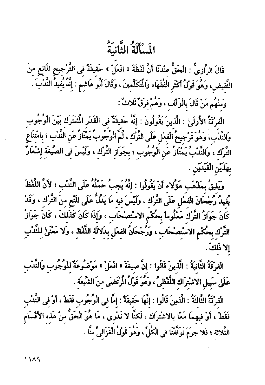 قال الرازي: الحق عندنا أن لفظة (افعل) حقيقة في الترجيح المانع من النقيض، وهو قول أكثر الفقهاء والمتكلمين، وقال أبو هاشم: إنه يفيد الندب ومنهم من قال بالوقف، وهو فرق ثلاث:
