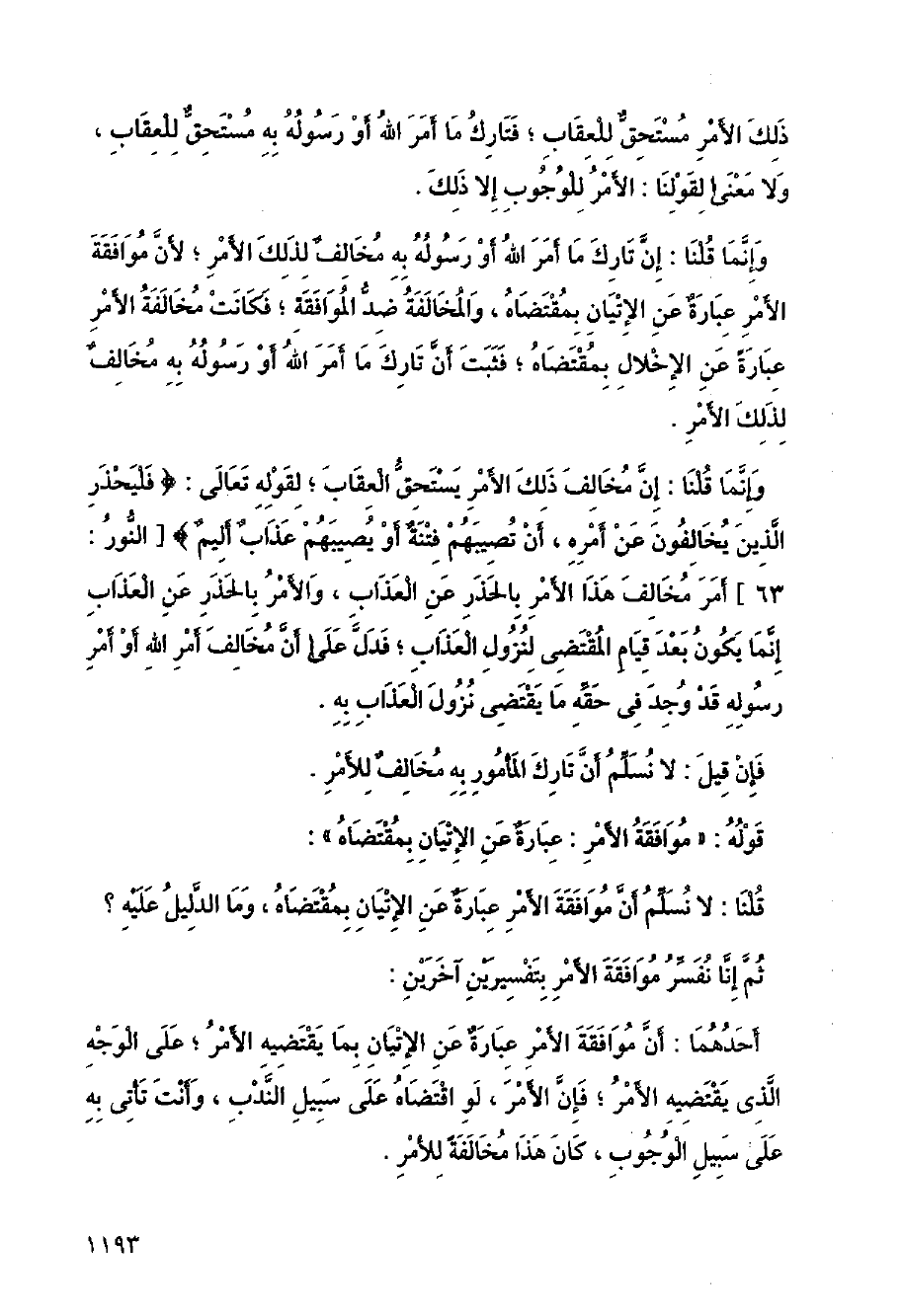 وإنما قلنا: إن مخالف ذلك الأمر يستحق العقاب، لقوله تعالى: (فليحذر الذين يخالفون عن أمره> أن تصيبهم فتنة أو يصيبهم عذاب أليك) [النور:63].