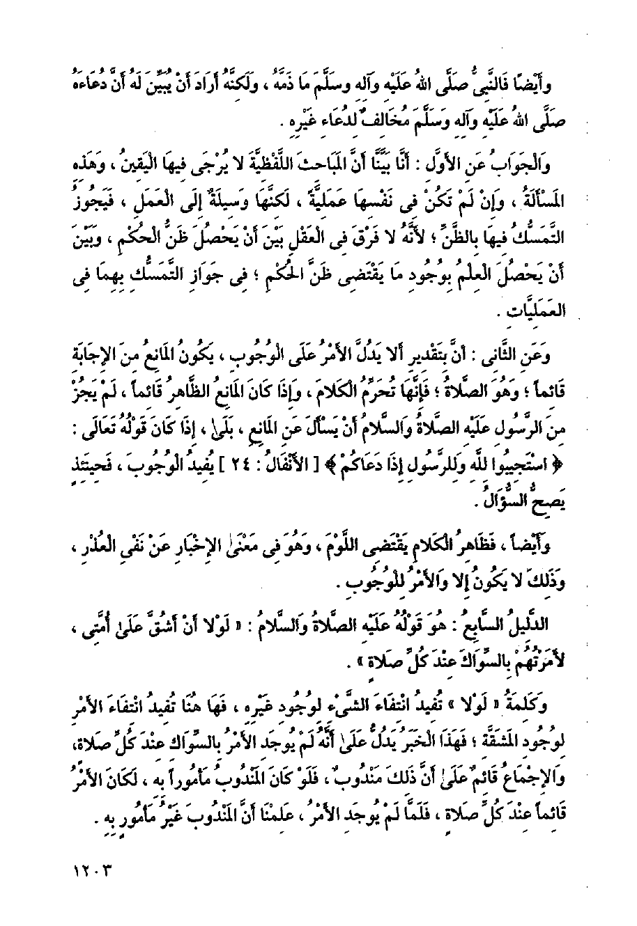 وعن الثاني: أن بتقدير ألا يدل الأمر على الوجوب، يكون المانع من الإجابة قائما، وهو الصلاة، فإنها تحرم الكلام، وإذا كان المانع الظاهر قائما، لم يجز من الرسول عليه الصلاة والسلام أن يسأل عن المانع، بلى، إذا كان قوله تعالى: (استجيبوا لله وللرسول إذا دعاكم) [الأنفال:24] يفيد الوجوب، فحينئذ يصح السؤال.