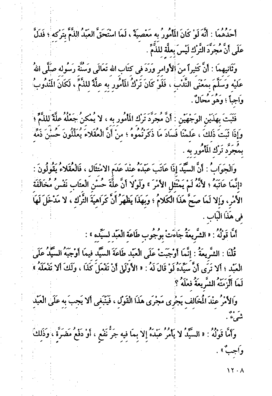 فثبت بهذين الوجهين: أن مجرد ترك المأمور به، لا يمكن جعله علة للذم، وإذا ثبت ذلك، علمنا ما ذكرتموه، من أن العقلاء يعللون حسن ذمه بمجرد ترك المأمور