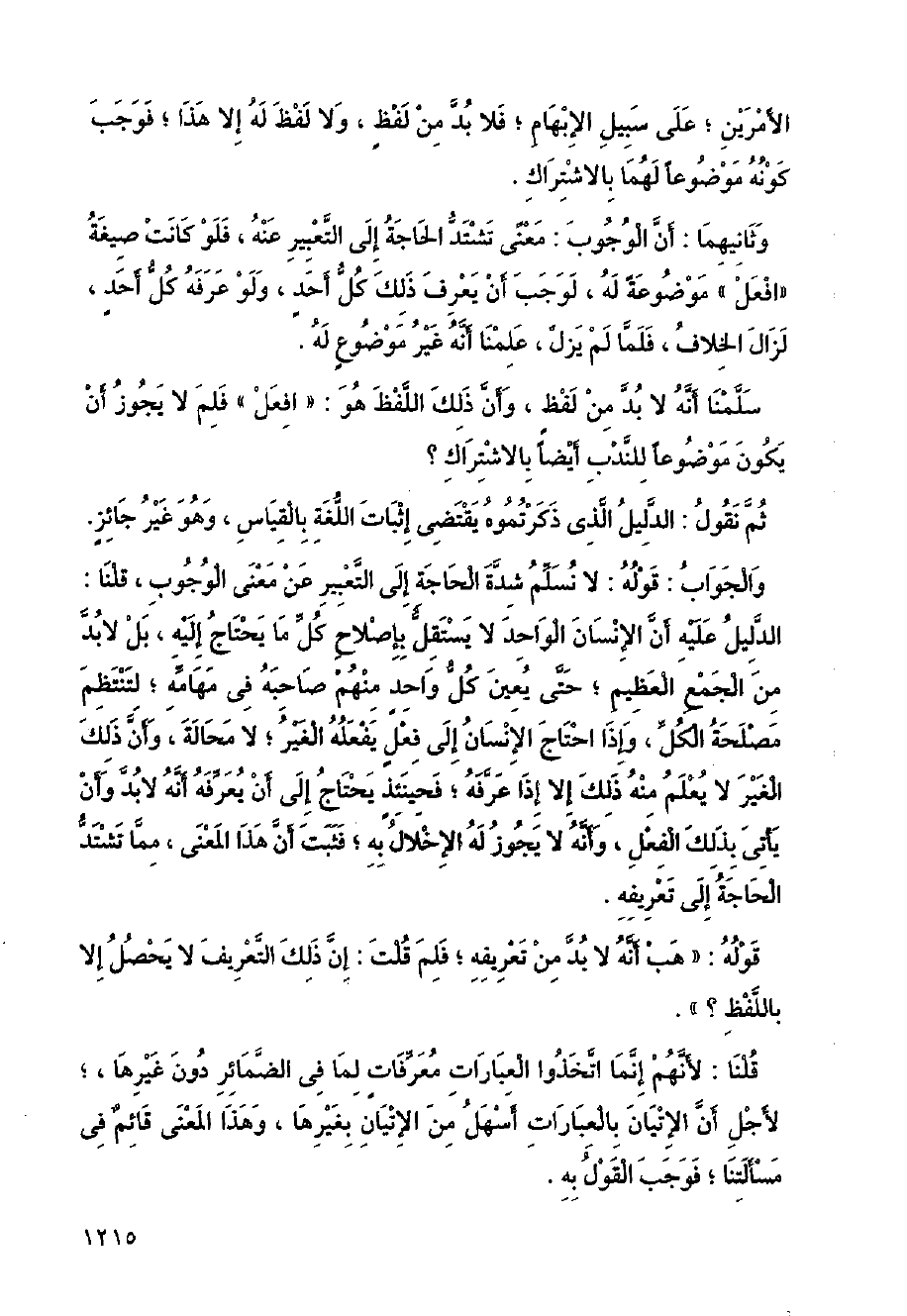 وثانيهما: أن الوجوب: معنى تشتد الحاجة إلي التعبير عنه، فلو كانت صيغة (افعل) موضوعة له، لوجب أن يعرف ذلك كل أحد، ولو عرفه كل أحد، لزال الخلاف، فلما لم يزل، علمنا أنه غير موضوع له سلمنا أنه لا بد من لفظ، وأن ذلك اللفظ هو: (افعل) فلم لا يجوز أن يكون موضوعا للندب أيضًا بالاشتراك؟