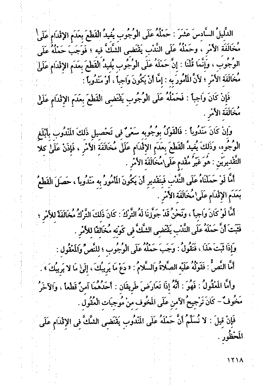 الدليل السادس عشر: حمله علي الوجوب يفيد القطع بعدم الإقدام على مخالفة الأمر، وحمله علي الندب يقتضي الشك فيه، فوجب حمله على الوجوب، وإنما قلنا: إن حمله علي الوجوب يفيد القطع بعدم الإقدام على مخالفة الأمر، لأن المأمور به: إما أن يكون واجبا، أو مندوبا:
