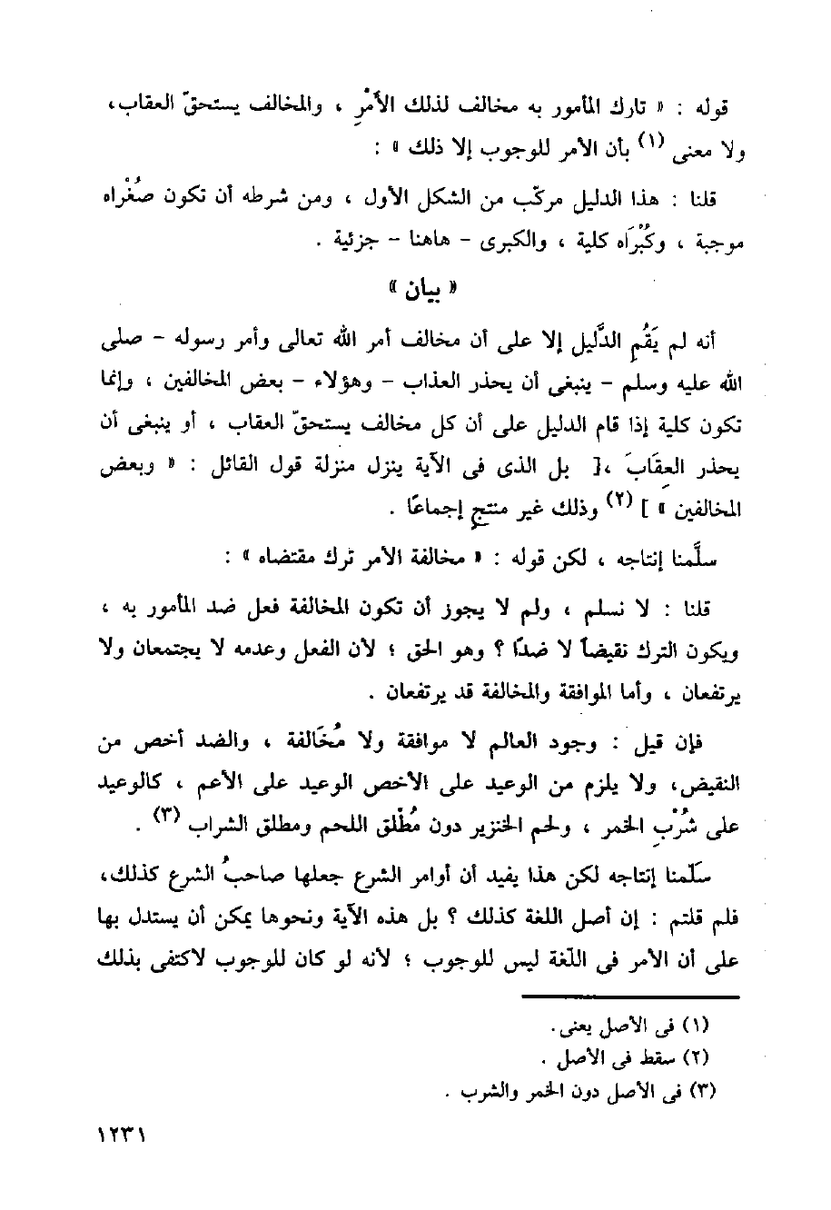 أنه لم يقم الدليل إلا على أن مخالف أمر الله تعالى وأمر رسوله، صلى الله عليه وسلم، ينبغي أن يحذر العذاب وهؤلاء بعض المخالفين، وإنما تكون كلية إذا قام الدليل على أن كل مخالف يستحق العقاب، أو ينبغي أن يحذر العقاب، [بل الذي في الآية ينزل منزلة قول القائل: (وبعض المخالفين)] وذلك غير منتج إجماعا.