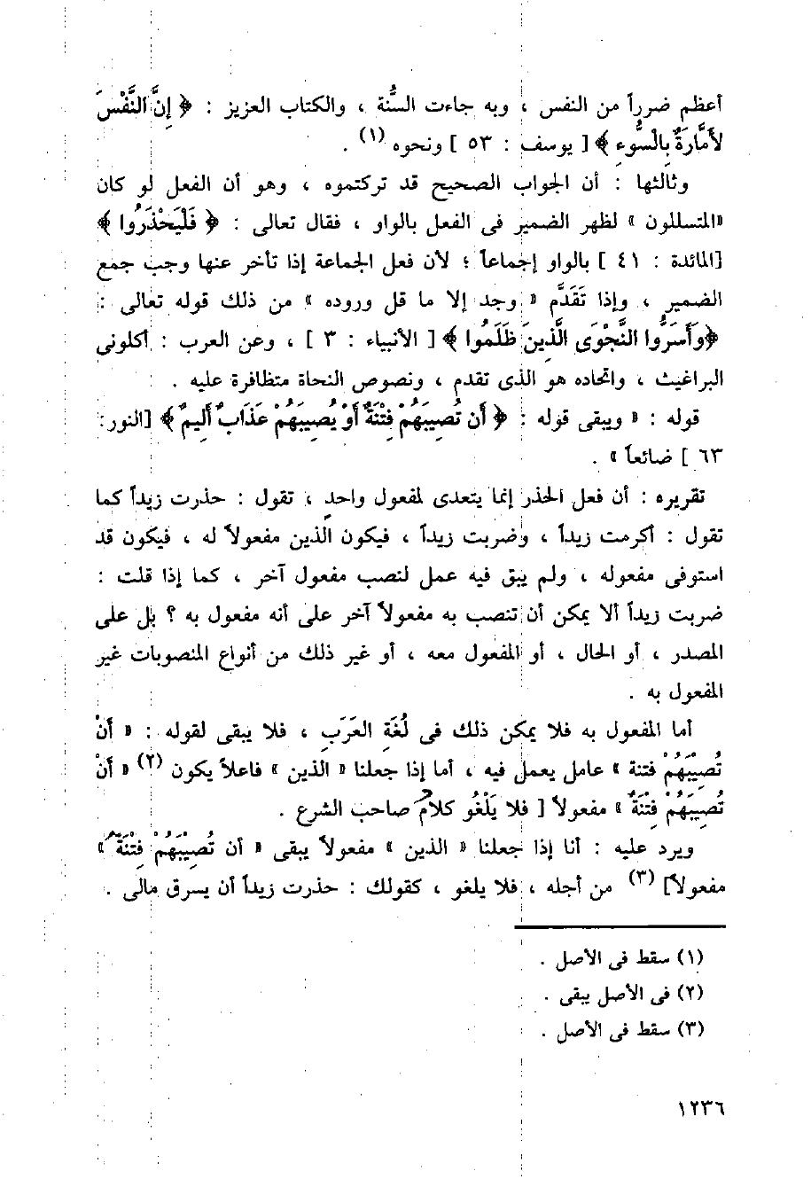 أما المفعول به فلا يمكن ذلك في لغة العرب، فلا يبقى لقوله: (أن تصيبيهم فتنة) عامل يعمل فيه، أما أذا جعلنا (الذين) فاعلا يكون (أن تصيبهم فتنة) عامل يعمل فيه، أما إذا جعلنا (آلذين) فاعلا يكون تصيبهم فتنة) مفعولا [فلا يلغو كلام صاحب الشرع.