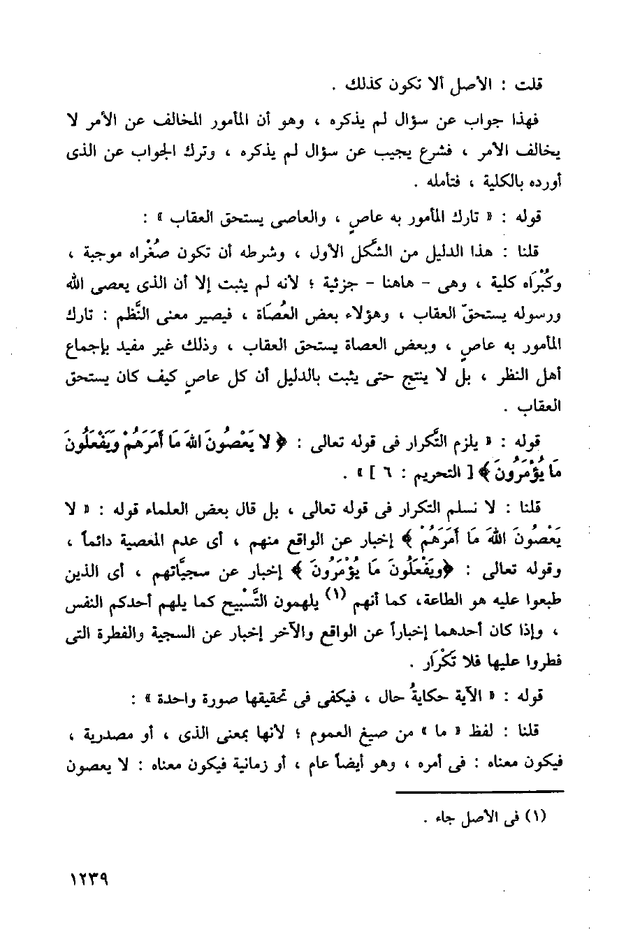 قوله: (يلزم التكرار في قوله تعالى: (لا يعصون الله ما زمرهم ويفعلون ما يؤمرون) [التحريم:6]).