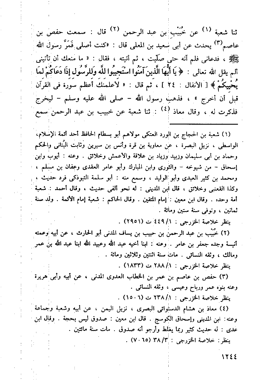 ثنا شعبة عن خبيب بن عبدالرحمن قال: سمعت حفص بن عاصم يحدث عن أبي سعيد بن المعلى قال: (كنت أصلي فمرّ رسول الله صلى الله عليه وسلم فدعاني فلم آته حتى صليت، ثم أتيته، فقال: (ما منعك أن تزتي ألم يقل الله تعالى: (يا أيها الذين آمنوا استجيبوا لله وللرسول إذا دعاكم لما يحييكم) [الأنفال:24] ثم قال: (لأعلمنك أعظم سورة في القرآن قبل أن أخرج)، فذهب رسول الله صلى الله عليه وسلم، ليخرج فذكرت له، وقال معاذ: ثنا شعبة عن خبيب بن عبد الرحمن سمع