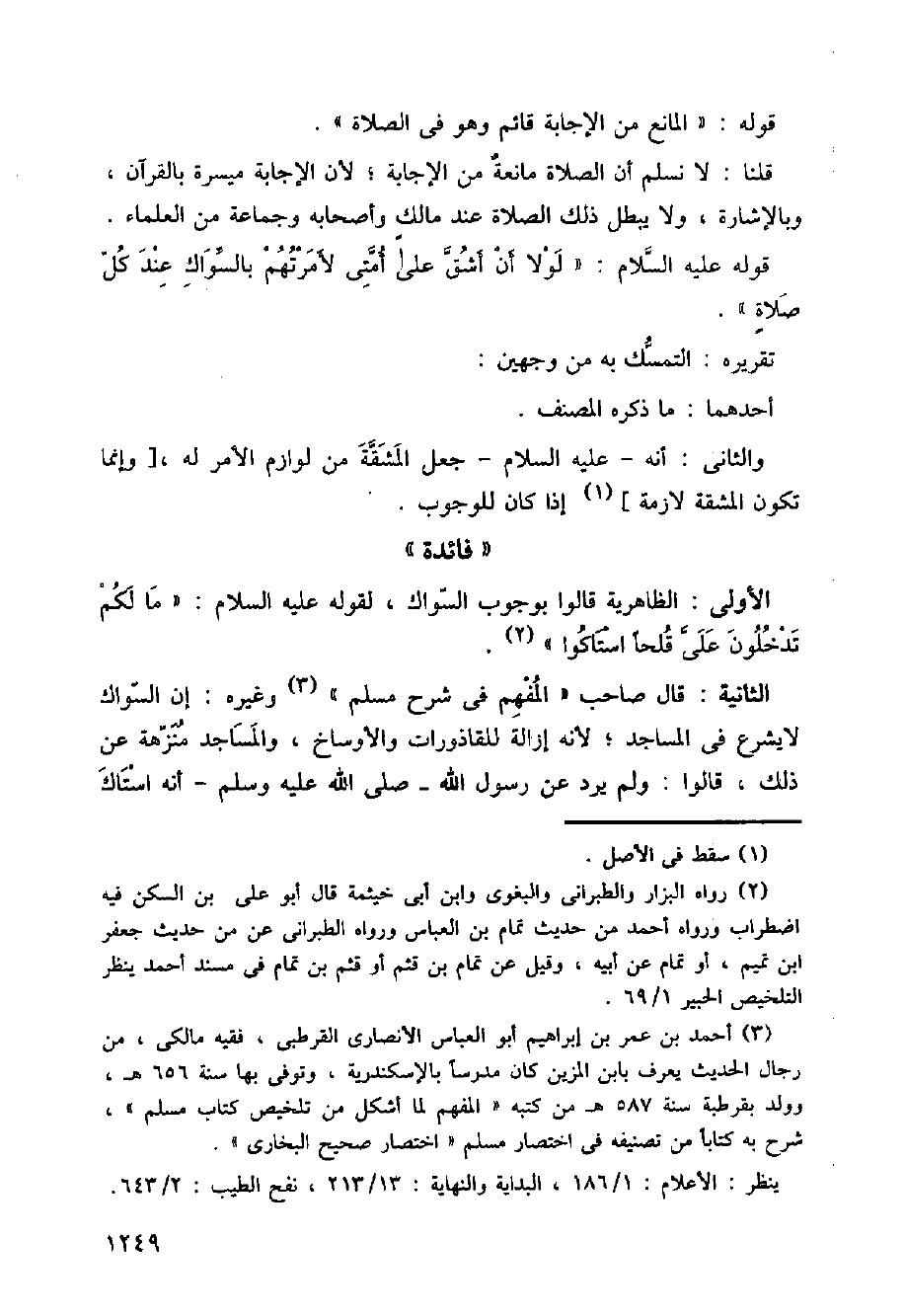 الثانية: قال صاحب (المفهم في شرح المسلم) وغيره: إن السواك لا يشرع في املساجد، لأنه إزالة للقاذورات والأوساخ، والمساجد منزهة عن ذلك، قالوا: ولم يرد عنن رسول الله صلى الله عليه وسلم أنه استاك