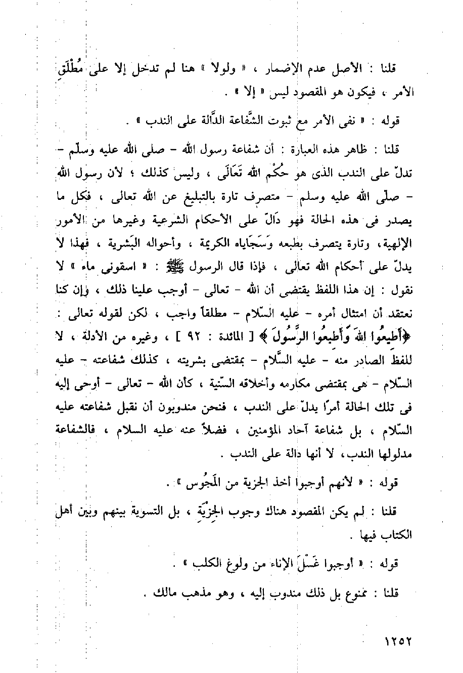 قلنا: ظاهر هذه العبارة: أن شفاعة رسول الله صلى الله عليه وسلم تدل على الندب الذي هو حكم الله تعالى، وليس كذلك، لأن رسول الله صلى اله عليه وسلم متصرف تارة بالتبليغ عن الله تعالى، فكل ما يصدر في هذه الحالة فهو دال على الأحكام الشرعية وغيرها من الإلهية، وتارة يتصرف بطبعه وسجاياه الكريمة، وأحواله البشرية، فهذا لا يدل على زحكام الله تعالى، فإذا قال الرسول صلى الله عليه وسلم: (اسقوني ماء) لا نقول: إن هذا اللفظ يقتضي أن الله تعالى أوجب علينا ذلك، وإن كنا نعتقد أن امتثال أمره عليه السلام مطلثا واجب، لكن لقوله تعالى: (أطيعوا الله وأطيعوا الرسول) [المائدة:92]، وغيره من الأدلة، لا للفظ الصادر منه عليه السلام بمقتضى بشريته، كذلك شفاعته عليه السلام هي بمقتضى ماكرمه وأخلاقه السنية، كأن الله تعالى أوحى إليه في تلك الحالة أمرا يدل على الندب، فنحن مندوبون أن نقبل شفاعته عليه السلام، بل شفاعة آحاد المؤمنين، فضلا عنه عليه السلام، فالشفاعة مدلولها الندب، لا أنها دالة على الندب.