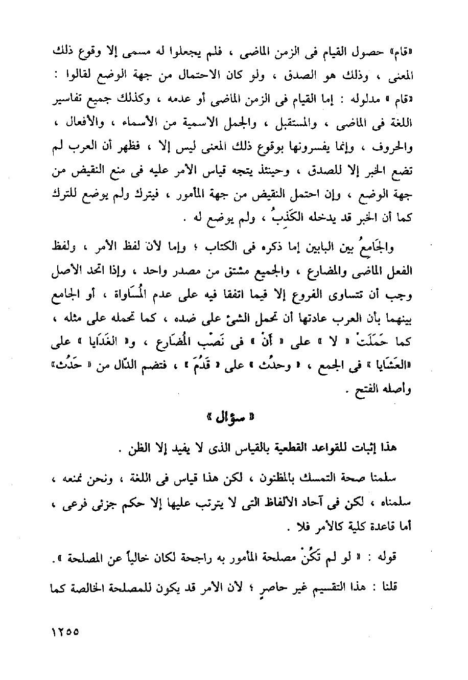 (قام) حصول القيام في الزمن الماضي، فلم يجعلوا له مسمى إلا وقوع ذلك المعنى، وذلك هو الصدق، ولو كان الاحتمال من جهة الوضع لقالوا: (قام) مدلوله: إما القيام في الزمن الماضي أو عدمه، وكذلك جميع تفاسير اللغة في الماضي، والمستقبل، والجمل الاسمية من الأسماء، والأفعال، والحروف، وإنما يفسرونها بوقوع ذلك المعنى ليس إلا، فظهر أن العرب لم تضع الخبر إلا للصدق، وحينئذ يتجه قياس الأمر عليه في منع النقيض من جهة الوضع، وإن احتمل النقيض من جهة المأمور، فيترك ولم يوضع للترك كما أن الخبر قد يدخله الكذب. ولم يوضع له.