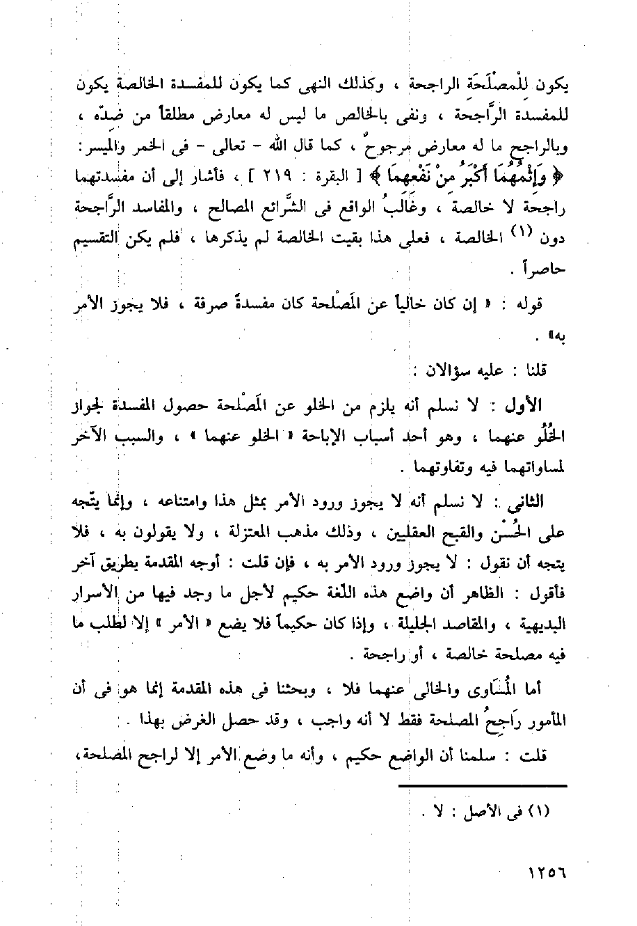 يكون للمصلحة الراجحة، وكذلك النهي كما يكون للمفسدة الخالصة يكون للمفسدة الراجحة، ونفي بالخالص ما ليس له معارضا مطلقا من ضده، وبالراجح ما له معارض مرجوح، كما قال الله تعالى في الخمر والميسر: (وإثمهما أكبر من نفعهما) [البقرة:219]، فأشار إلى أن مفسدتهما راجحة لا خالصة، وغالب الواقع في الشرائع المصالح، والمفاسد الراجحة دون الخالصة، فعلى هذا بقيت الخالصة لم يذكرها، فلم يكن التقسيم حاصرا.