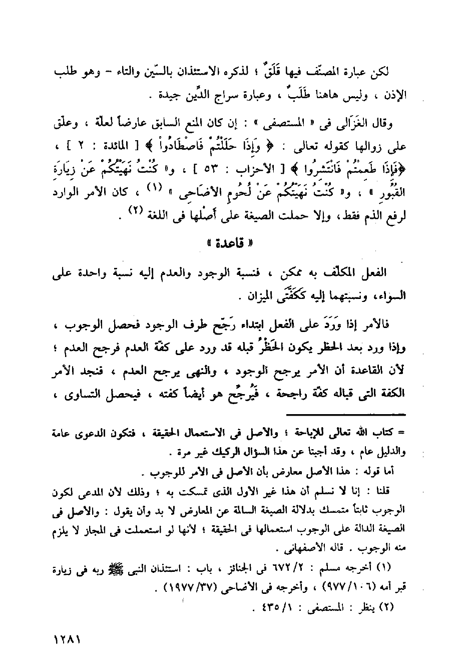 وقال الغزالي في (المستصفى): إن كان المنع السابق عارضا لعلة، وعلق على زوالها كقوله تعالى: (وإذا حللتم فاصطادوا) [المائدة:2]، (فإذا طعمتم فانتشروا) [الأحزاب:53]، و (كنت نهيتكم عن زيارة القبور)، و (كنت نهيتكم عن لحوم الأضاحي)، كان الأمر الوارد لرفع الذم فقط، وإلا حملت الصيغة على أصلها في اللغة.