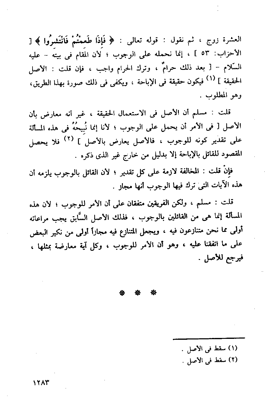 العشرة زوج، ثم نقول: قوله تعالى: (فإذا طعمتم فانتشروا) [الأحزاب:53]، إنما نحمله على الوجوب، لأن المقام في بيته، عليه السلام [بعد ذلك حرام، وترك الحرام واجب، فإن قلت: الأصل الحقيقة] فيكون حقيقة في الإباحة، ويكفي في ذلك صورة بهذا الطريق، وهو المطلوب.