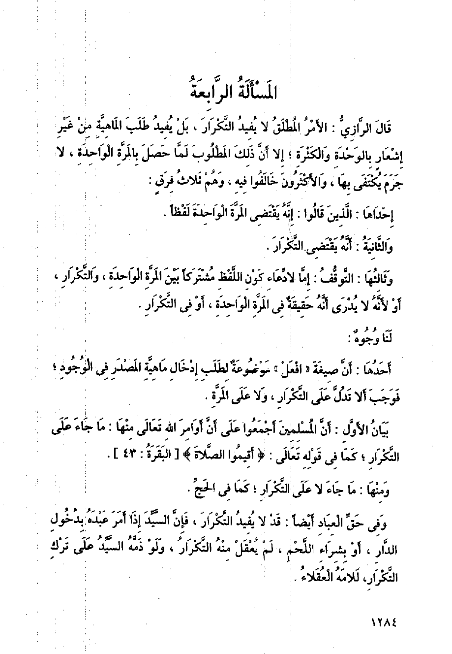 قال الرازي: الأمر المطلق لا يفيد التكرار، بل يفيد طلب الماهية من غير إشعار بالوحدة والكثرة، إلا أن ذلك المطلوب لما حصل بالمرة الواحدة لا جرم يكتفى بها، والأكثرون خالفوا فيه، وهو ثلاث فرق: