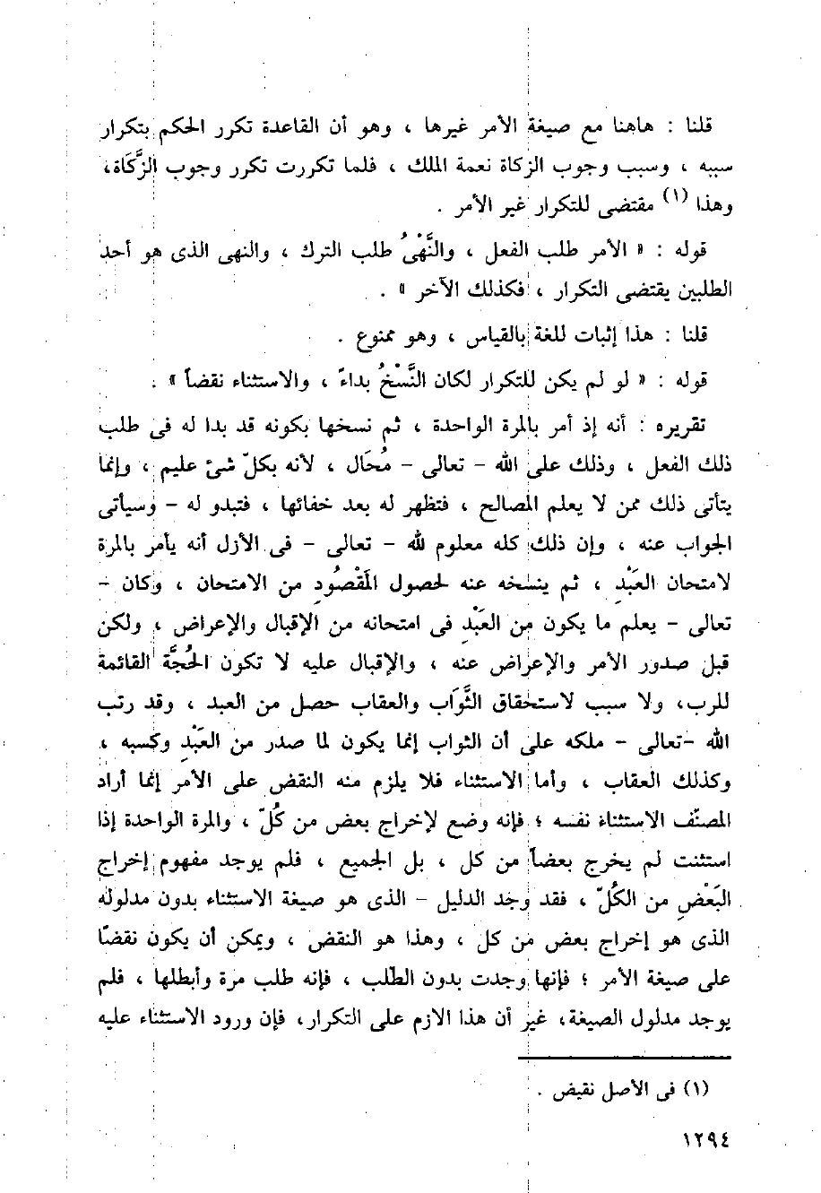تقريره: أنه إذ أمر بالمرة الواحدة، ثم نسخها بكونه قد بدا له في طلب ذلك الفعل، وذلك على الله تعالى محال، لأنه بكل شيء عليم، وإنما يتأتى ذلك ممن لا يعلم المصالح، فتظهر له بعد خائها، فتبدو له وسيأتي الجواب عنه، وإن ذلك كله معلوم لله تعالى في الأزل أنه يأمر بالمرة لامتحان العبد، ثم ينسخه عنه لحصول المقصود من الامتحان، وكان تعالى يعلم الأمر والإعراض عنه، والإقبال عليه لا تون الحجة القائمة للرب، ولا سبب لاستحقاق الثواب والعقاب حصل من العبد، وقد رتب الله تعالى ملكه على أن الثواب إنما يكون لما صدر من العبد وكسبه، وكذلك العقاب، وأما الاستثناء فلا يلزم منه النقض على الأمر إنما أراد المصنف الاستثناء نفسه، فإنه وضع لإخراج بعض من كل، والمرة الواحدة إذا استثنت لم يخرج بعضا من كل، بل الجميع، فلم يوجد مفهوم إخراج البعض من الكل، فقد وجد الدليل الذي هو صيغتة الاستثناء بدون مدلوله الذي هو اخراج بعض من كل، وهذا هو النقض، ويمكن أن يكون نقضا على صيغة الأمر، فإنها وجدت بدون الطلب، فإن طلب مرة وأبطلها، فلم يوجد مدلول الصيغة، غير أن هذا الازم على التكرار، فإن ورود الاستثناء عليه