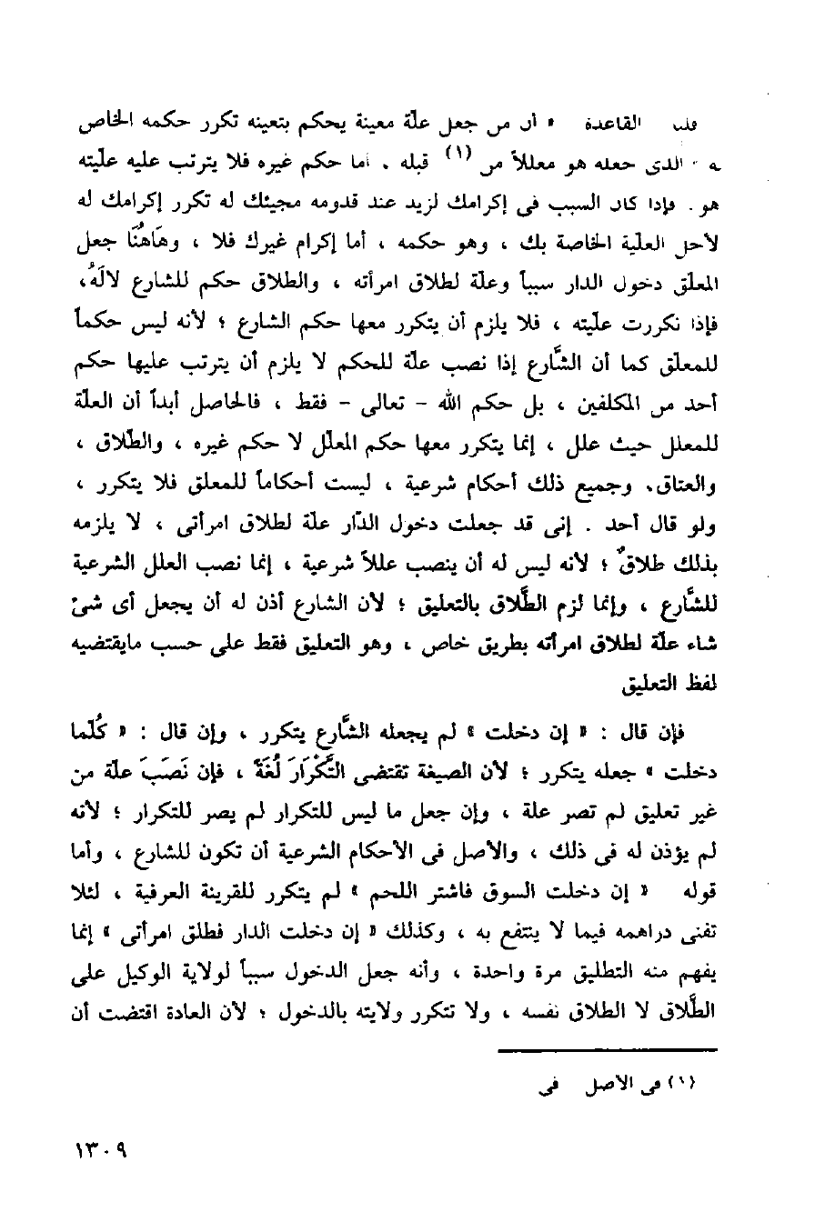 قلنا: القاعدة: (أن من جعل علة معينة يحكم بتعينه تكرر حكمه الخاص به، الذي جعله هو معللا من قبله، أما حكم غيره فلا يترتب عليه علّيته هو. فإذا كان السبب في إكرام غيرك فلا، وهاهنا جعل المعلق دخول الدار سببا وعلّة لطلا امرأته، والطلاق حكم للشارع، لأنه ليس حكما لاله، فإذا تكررت عليته، فلا يلزم أن يتكرر معها حكم الشارع، لأنه ليس حكما للمعلق كما أن الشارع إذا نصب علته للحكم لا يلزم أن يترتب عليها حكم أحد من المكلفين، بل حكم الله تعالى فقط، فالحاصل أبدا أن العلة للمعلل حيث علل، إنما يتكرر معها حكم المعلل لا حكم غيره، والطلاق، والعتاق، وجميع ذلك أحكام شرعية، ليست أحكاما للمعلق فلا يتكرر، ولو قال أحد، إني قد جعلت دخول الدار علّة لطلاق امرأتي، لا يلزمه بذلك طلاق، لأنه ليس له أن ينصب عللا شرعية، إنما نصب العلل الشرعية للشارع، وإنما لزم الطلاق بالتعليق، لأن الشارع أذن له أن يجعل أي شيء شاء علة لطلاق امرأته بطريق خاص، وهو التعليق فقط على حسب ما يقتضيه لفظ التعليق.