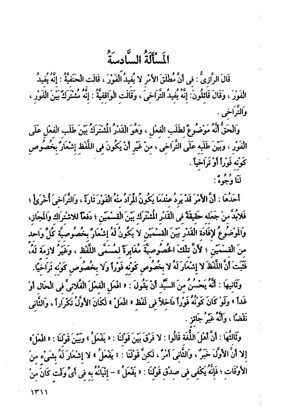 قال الرازي: في أن مطلق الأمر لا يفيد الفور، فالت الحنفية: إنه يفيد الفور، وقال قائلون: إنه يفيد التراخي، وقالت الواقفية: إنه مشترك بين الفور والتراخي.