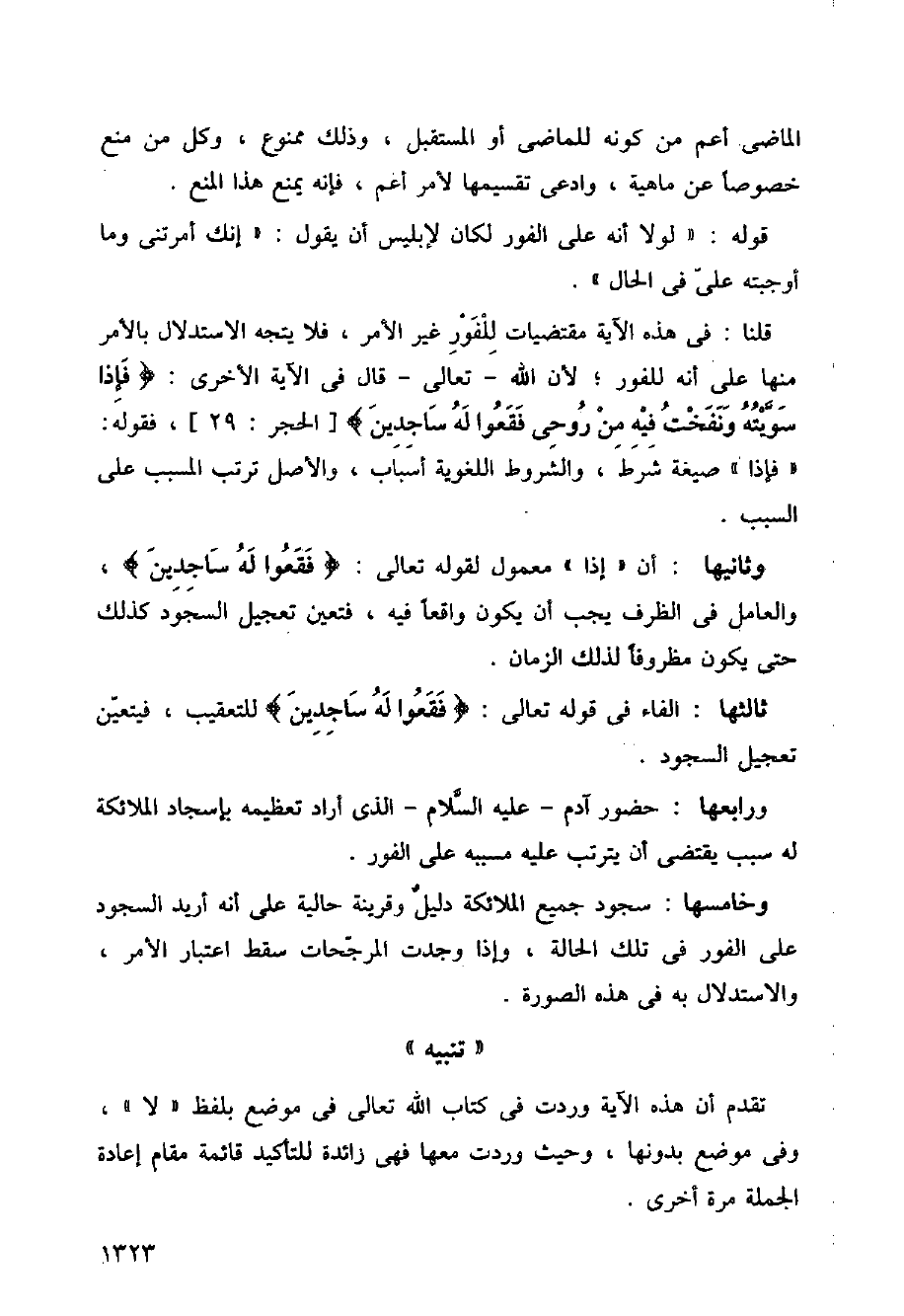 قلنا: في هذه الآية مقتضيات للفور غير الأمر، فلا يتجه الاستدلال بالأمر منها علي أنه للفور، لأن الله تعالى قال في الآية الأخرى: (فإذا سوّيته ونفخت فيه من روحي فقعوا له ساجدين) [الحجر:29]، فقوله تعالى (فإذا) صيغة شرط، والشروط اللغوية أسباب، والأصل ترتيب المسبب على السبب.