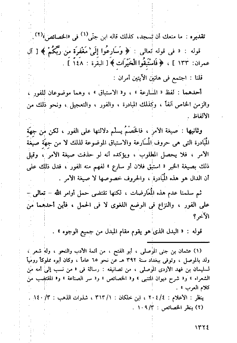 وثانيها: صيغة الأمر، فالخصم يسلم دلالتها على الفور، لكن من جهة المبادرة التي هي حروف المسارعة والاستباق الموضوعة لذلك لا من جهة صيغة الأمر، فلا يحصل المطلوب، ويؤكده أنه لو حذفت صيغة الأمر، وقيل ذلك بصيغة الخبر (استبق فلان أو سارع) لفهم منه الفور، فدل ذلك على أن الدال هو هذه المبادرة، والحروف خصوصها لا صيغة الأمر.