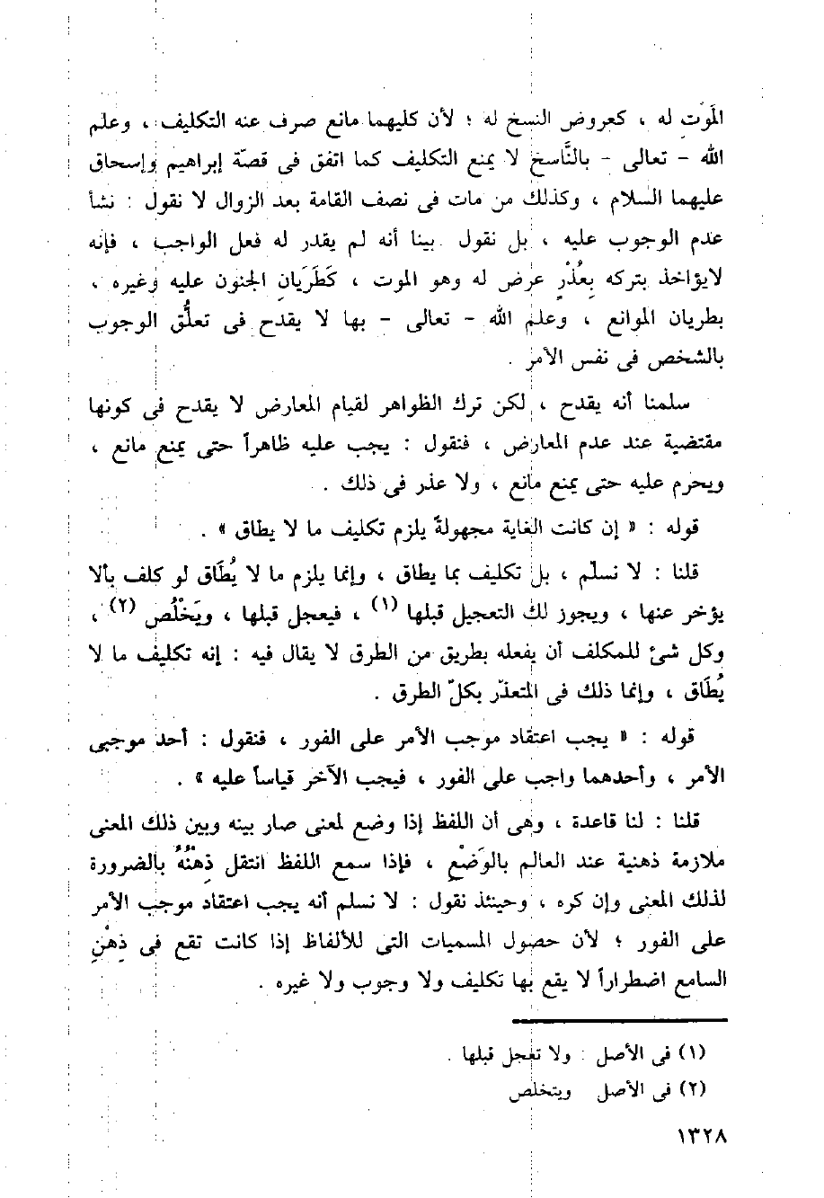 الموت له، معروض النسخ له، لأن كليهما مانع صرف عن التكليف، وعلم الله تعالى بالناسخ لا يمنع التكليف كما اتفق في قصة إبراهيم وإسحاق عليهما السلام، وكذلك من مات في نصف القامة بعد الزوال لا نقول: نشأ عدم الوجوب عليه، بل نقول بينا أنه لم يقدر له فعل الواجب، فإنه لا يؤاخذ بتركه بعذر عرض له وهو الموت، كطريان الجنون عليه وغيره، بطريان الموانع، وعلم الله تعالى بها لا يقدح في تعلق الوجوب بالشخص في نفس الأمر.