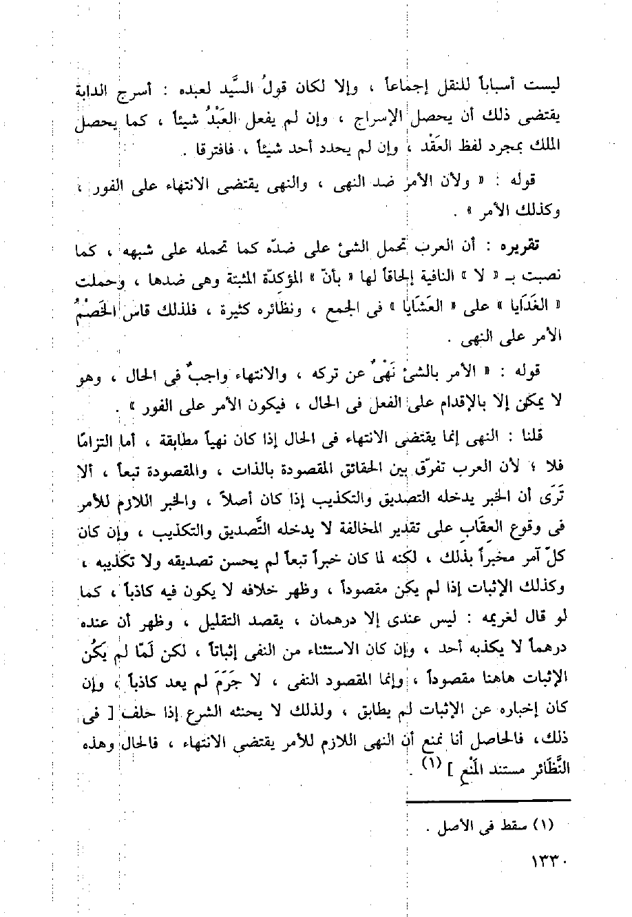قلنا: النهي إنما يقتضي الانتهاء في الحال إذا كان نهيا مطابقة، أما التزاما فلا، لأن العرب تفرّق بين الحاقائق المقصودة بالذات، والمقصودة تبعا، ألا ترى أن الخبر يدخله التصديق والتكذيب إذا كان أصلا، والخبر اللازم للأمر في وقوع العقاب على تقدير المخالفة لا يدخله التصديق والتكذيب إذا كان أصلا، والخبر اللازم للأمر في وقوع العقاب علي تقدير المخالفة لا يدخله التصديق والتكذيب، وإن كان آمر مخبرا بذلك، لكنه لما كان خبرا تبعا لم يحسن تصديقه ولا تكذيبه، وكذلك الإثبات إذا لم يكن مقصودا، وظهر خلافه لا يكون فيه كاذبا، كما لو قال لغريمه: ليس عندي إلا درهمان، يقصد التقليل، وظهر أن عنده درهما لا يكذبه أحد، وإن كان الاستثناء من النفي إثباتا، لكن لمّا لم يكن الإثبات هاهنا مقصودا وإنما المقصود النفي، لا جرم لم يعد كاذبا وإن كان إخباره عن الإثبات لم يطابق، ولذلك لا يحنثه الشرع إذا حلف [في ذلك، فالحاصل أنا نمنع أن النهي اللازم للأمر يقتضي الانتهاء، فالحال وهذه النظائر مستند المنع].