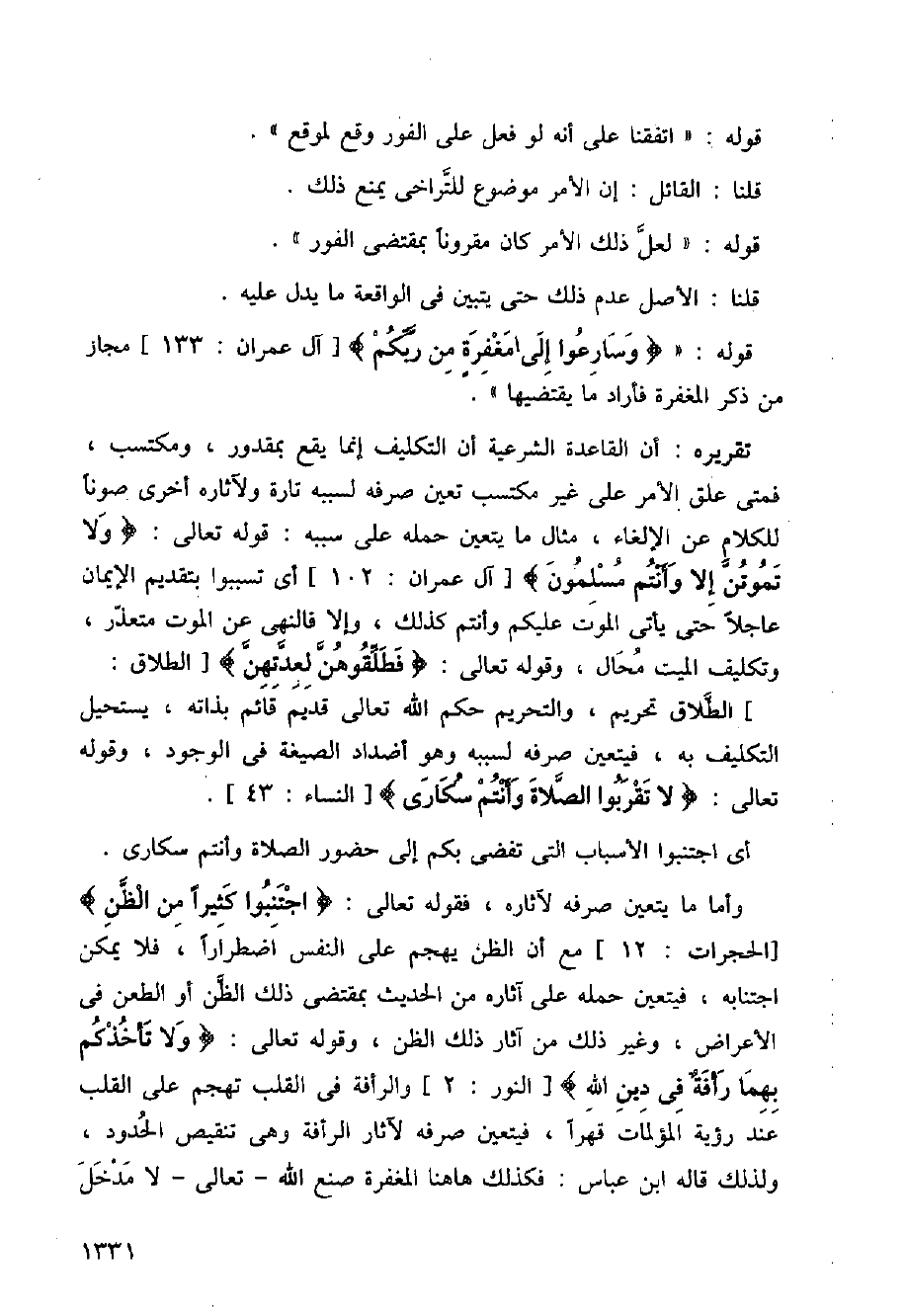 وأما ما يتعين صرفه لأثاره، فقوله تعالى: (اجتنبوا كثيرا من الظن) [الحجرات:12] مع زن الظن يهجم على النفس اضطرارا، فلا يمكن اجتنابه، فيتعين حمله على آثاره من الحديث بمقتضى ذلك الظن أو الطعن في الأعراض، وغير ذلك من آثار ذلك الظن، وقوله تعالى: (ولاتأخذنكم بهما رأفة في دين الله) [النور:2] والرأفة في القلب تهجم على القلب عند رؤية المؤلمات قهرًا، فيتعين صرفه لآثار الرأفة وهي تنقيص الحدود، ولذلك قاله ابن عباس: فكذلك هاهنا المغفرة صنع الله تعالى لا مدخل