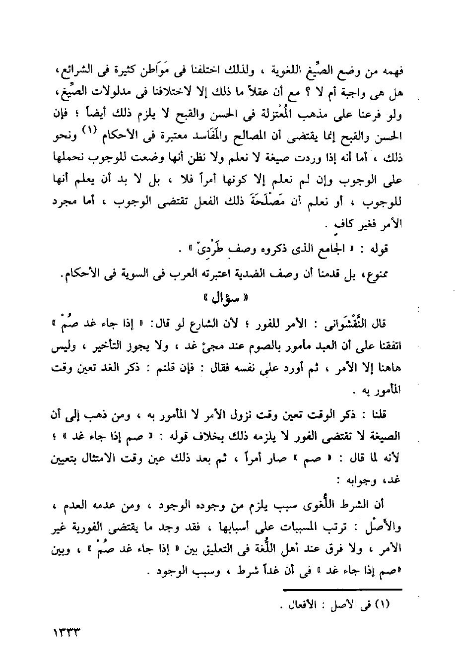 أن الشرط اللغوي سبب يلزم من وجوده الوجود، ومن عدمه العدم والأصل: ترتيب المسببات على أسبابها، فقد وجد ما يقتضي الفورية غير الأمر، ولا فرق عند أهل اللغة في التعليق بين (إذا جاء غد صم)، وبين (صم إذا جاء غد) في أن غدا شرط وسبب الوجود
