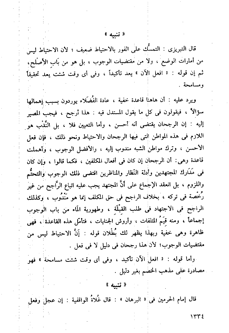 قال التبريزي: التمسك على الفور بالاحتياط ضعيف، لأن الاحتياط ليس من أمارات الوضع، ولا من مقتضيات الوجوب، بل هو من باب الأصلح ثم إن قوله: (افعل الآن) بعد تأكيدا، وفي أي وقت شئت يعد تحقيقا ومسامحة.