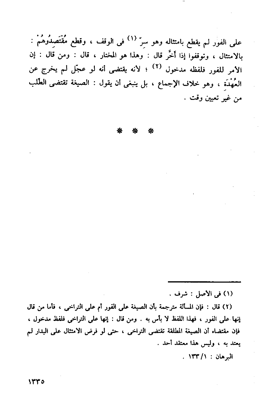 على الفور لم يقطع بامتثاله وهو سر في الوقف، وقطع مقتصدوهم: بالامتثال وتوقفوا إذا أخر قال: وهذا هو المختار، قال: ومن قال: إن الأمر للفور فلفظه مدخول؛ لأنه يقتضي أنه لو عجّل لم يخرج عن العهدة، وهو خلاف الإجماع، بل ينبغي أن يقول: الصيغة تقتضي الطلب من غير تعيين وقت.