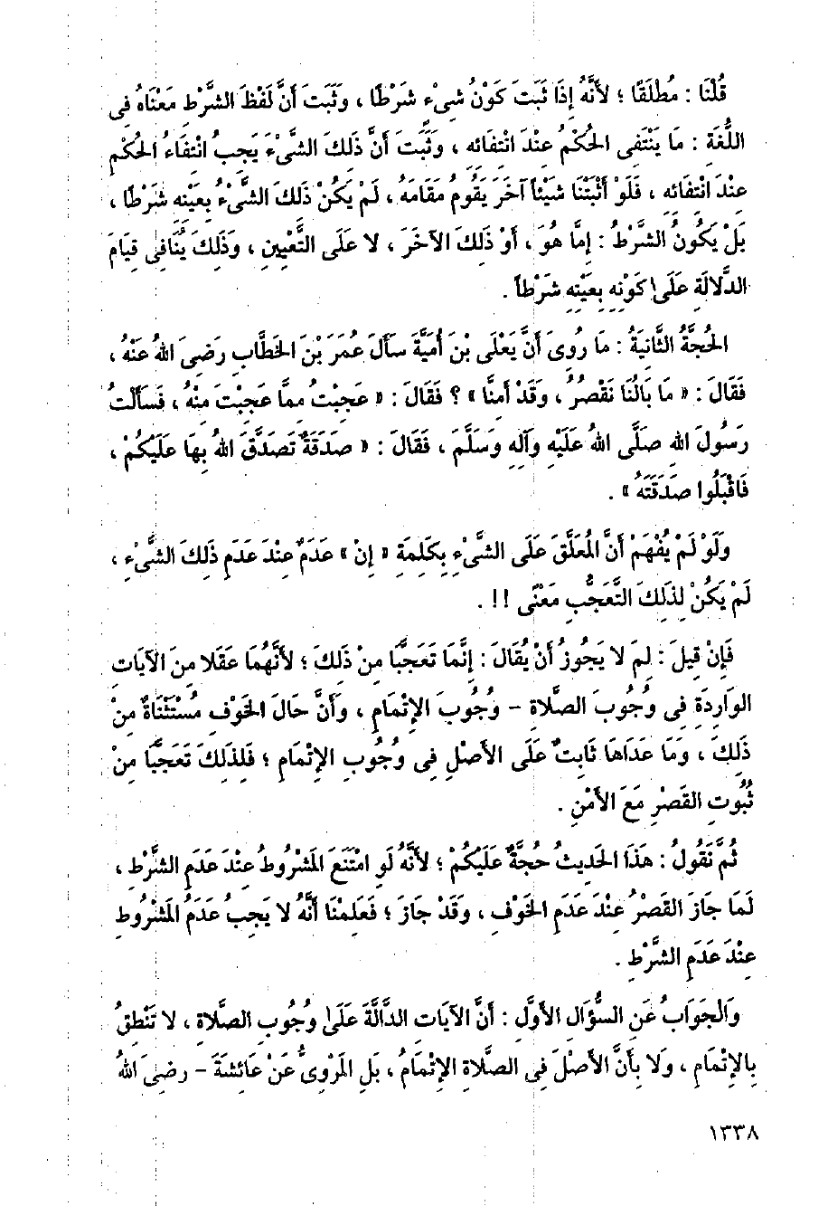 ثم نقول: هذا الحديق حجة عليكم لأنه لو امتنع المشروط عند عدم الشرط لما جاز القصر عند عدم الخوف وقد جاز فعلمنا أنه لا يجب عدم المشروط عند عدم الشرط