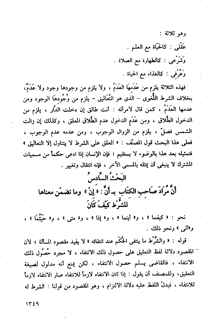 فهذه الثلاثة يلزم من عدمها العدم، ولا يلزم من وجودها وجود ولا عدم، بخلاف الشرط اللغوي الذي هو التعاليق يلزم من وجودها الوجود ومن عدمها العدم، كمن قال لامرأته: أنت طالق إن دخلت الدار، يلزم من الدخول الطلاق، ومن عدم الدخول عدم الطلاق المعلق، وكذلك إن زالت الشمس فصل، يلزم من الزوال الوجوب، ومن عدمه عدم الوجوب، فعلى هذا البحث قول المصنف: (المعلق على الشرط لا يتناول إلا التعاليق) فتمثيله بعد هذا بالوضوء لا يستقيم؛ فإن الإنسان إذا ادعى حكما من مسميات المشترك لا ينبغي أن يمثله بالمسمى الآخر، فإنه انتقال وتغيير.