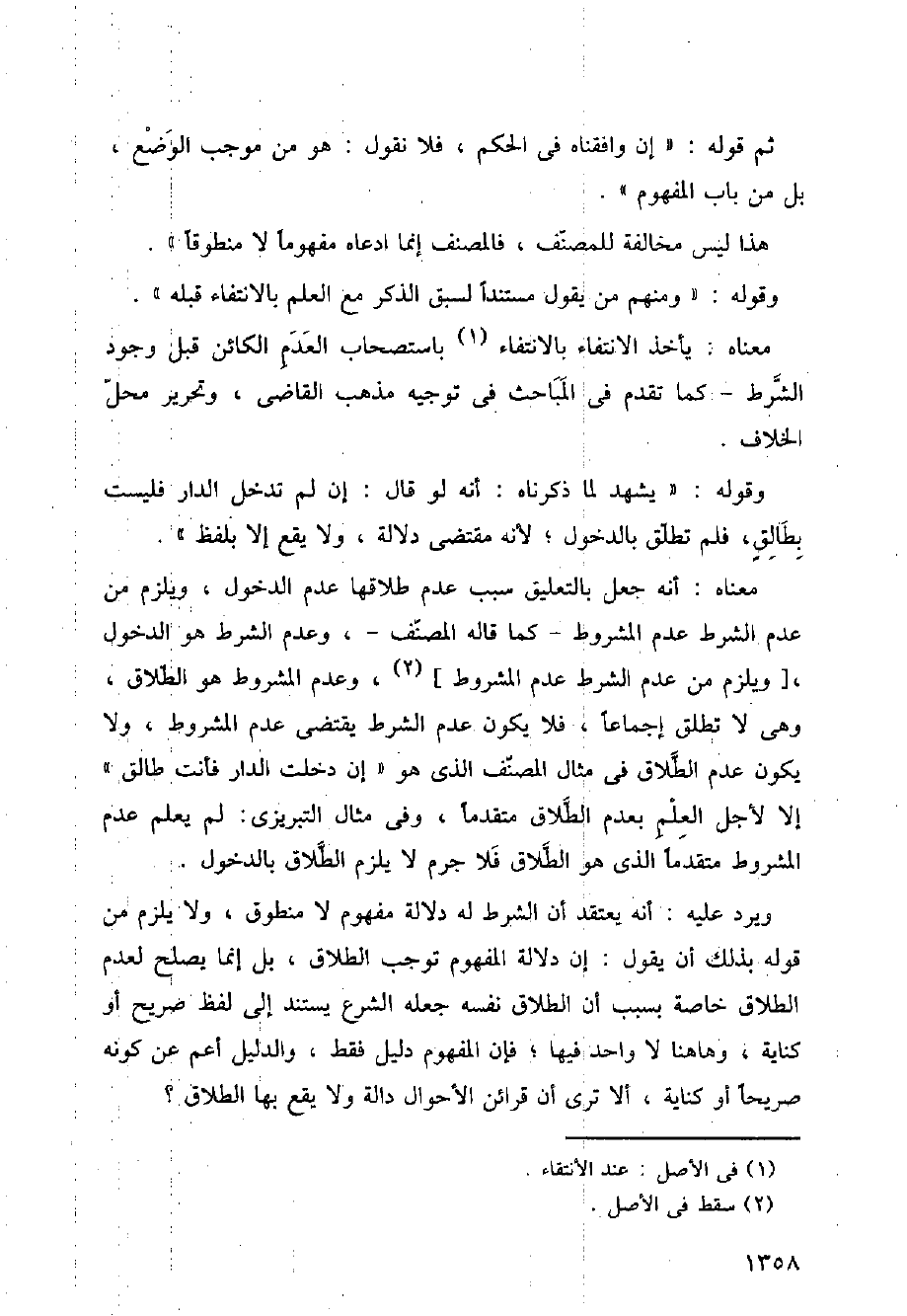ويرد عليه: أنه يعتقد أن الشرط له دلالة مفهوم لا منطوق، ولا يلزم من قوله بذلك أن يقول: إن دلالة الشرط له دلالة مفهوم لا منطوق، ولا يلزم من قوله بذلك أن يقول: إن دلالة المفهوم توجب الطلاق، بل إنما يصلح لعدم الطلاق خاصة بسبب أن الطلاق نفسه جعله الشرع يستند إلي لفظ صريح أو كناية، وهاهنا لا واحد فيها، فإن المفهوم دليل فقط، والدليل أعم عن كونه صريحا أو كناية، ألا ترى أن قرائن الأحوال دالة ولا يقع بها الطلاق؟