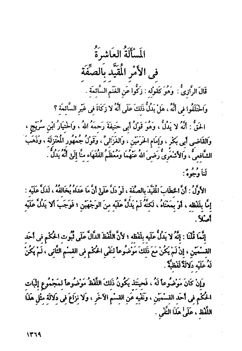 الأول أن الخطاب المقيد بالصفة لو دل على أن ما عداه يخالفه لدل عليه إما بلفظه، أو بمعناه لكنه لم يدل عليه من اولجهين فوجب ألا يدل عليه أصلا.